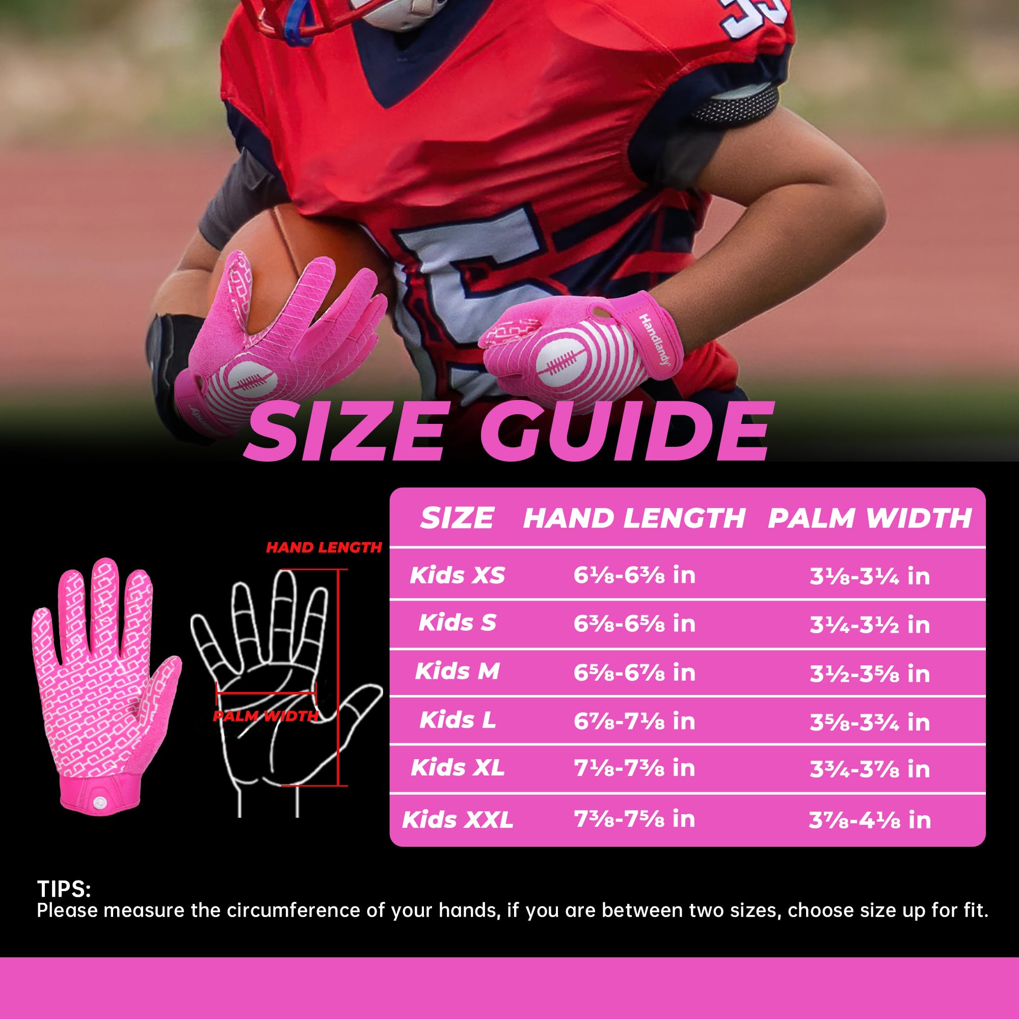 Amazing grip football gloves, keep the ball in hand : One piece tacky silicone palm design for an excellent grip to helps kids catch and hold on to footballs, durable and comfortable. These youth football gloves are suitable for teenagers, please refer to the scale table when purchasing!