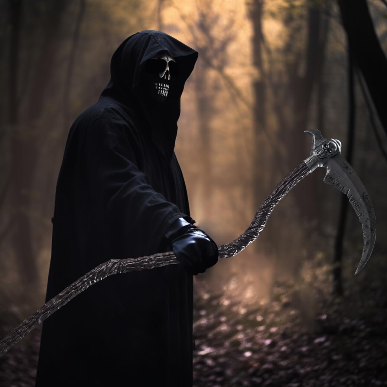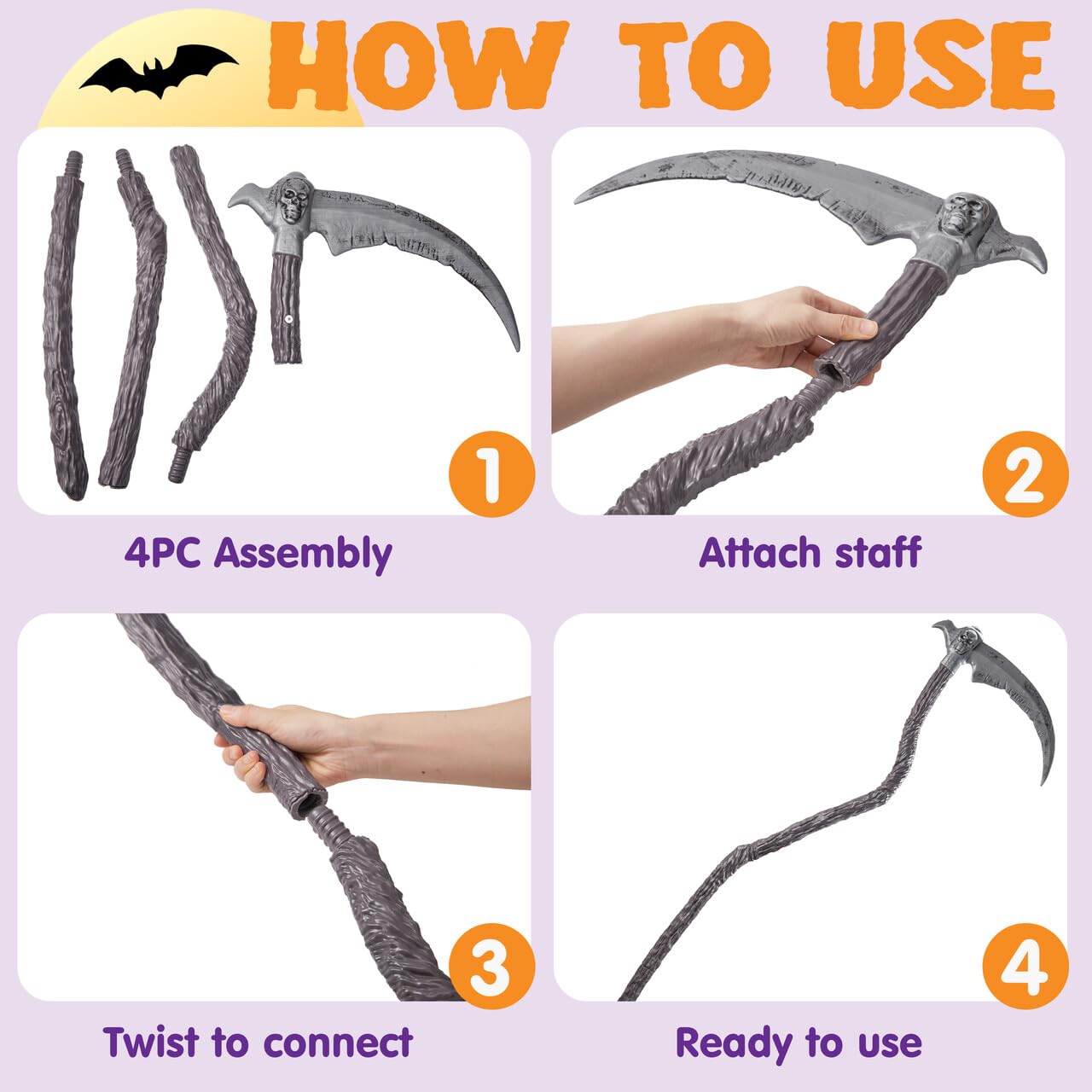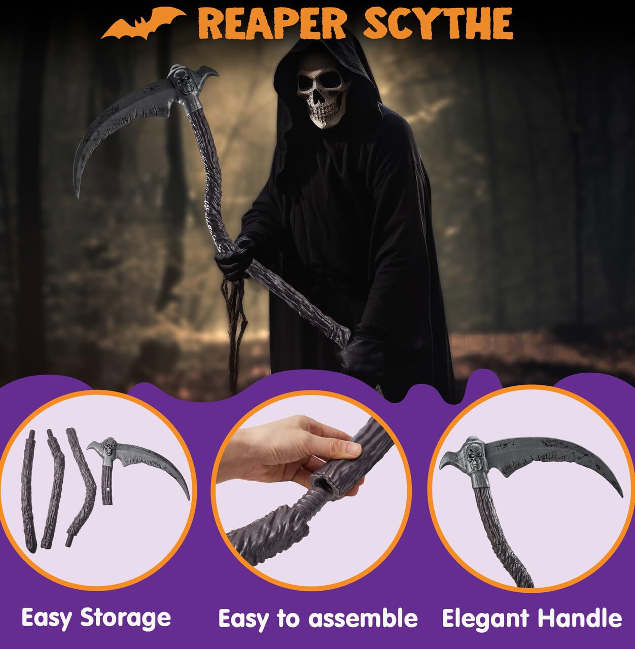 Wonderful Details. Our grim reaper scythe is designed in a standard size, offering an ideal length for use. They can be easily assembled and disassembled, making storage a breeze. The Halloween Reaper Scythe features a haunting design that perfectly captures the essence of the Grim Reaper.
