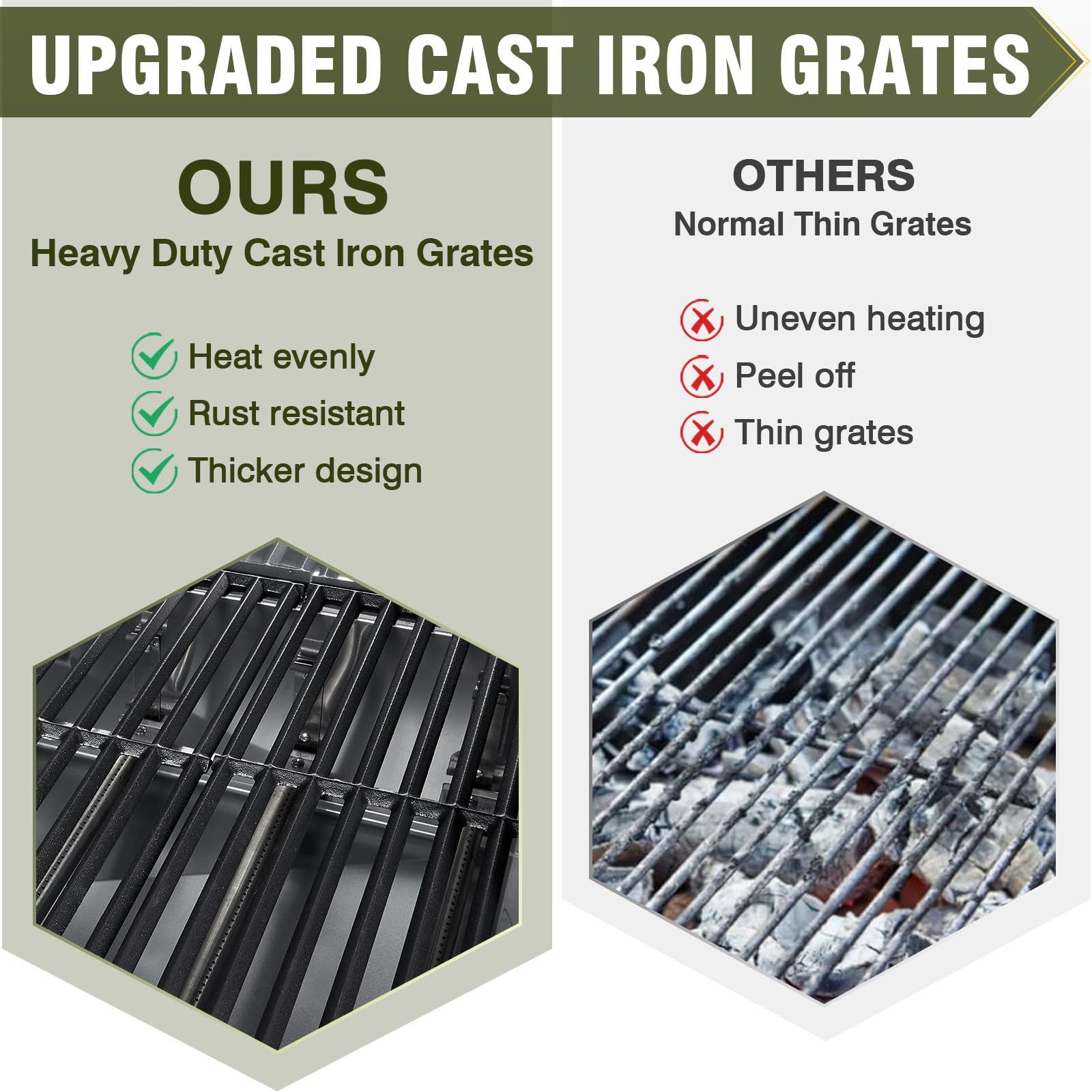 🔥 【Commercial-Grade Cooking Space】 Massive 447 sq in porcelain-enameled grates + 200 sq in warming rack. Fits 40+ burgers or 8 racks of ribs. Heavy-duty cast iron grates retain heat evenly for perfect sear marks.
