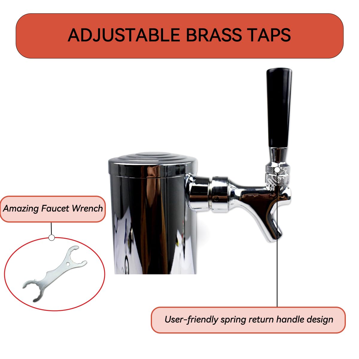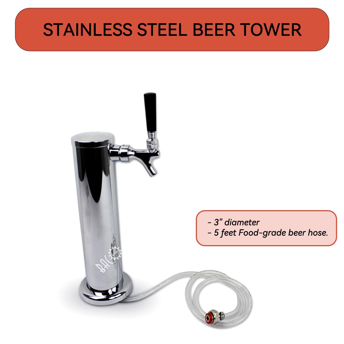 SINGLE FAUCET DRAFT BEER TOWER: Featuring a beautiful Standard-plated metal finish and a matching Standard-plated faucet with metal lever, this 3" diameter air-cooled Kegco D4743T draft beer tower is the same stylish tower used on most commercial grade kegerators. This tower conveniently includes 5 feet of clear beer tubing ending in a nozzle and hex nut assembly for quick connection to all standard keg couplers, as well as a gasket and for screws for easy mounting.