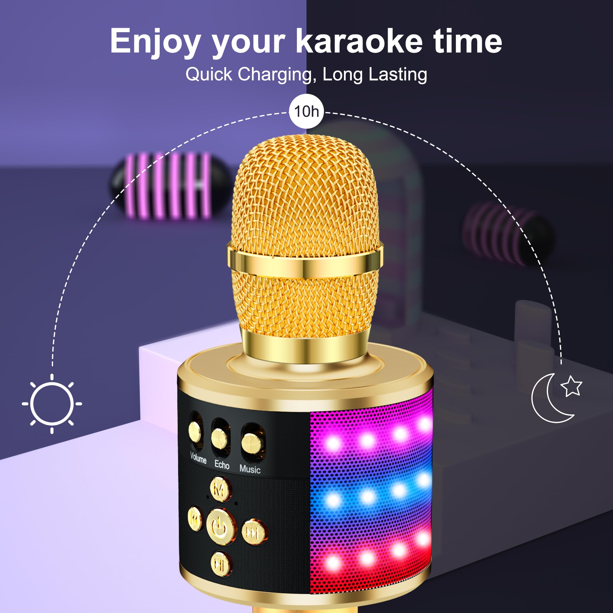 【Excellent Live Show】— Multi-layer denoising head, powerful stereo speaker, professional buttons, and brief layout, all allow you to enjoy an aural carnival. Let this microphone light up your party.