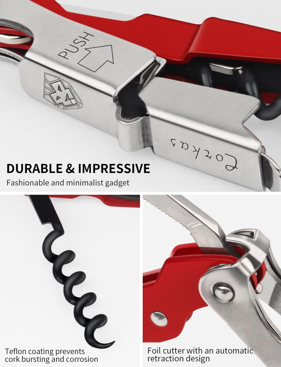 ✅【EFFORTLESS WINE EVERY TIME】Effortlessly glide through any cork with the CORKAS waiters corkscrew. The double-hinged fulcrum provides extra leverage for smoother extraction to ensure smooth, frustration-free uncorking. Its Teflon-coated worm could reduces friction and noise, easier to glide through corks, minimizing wear and tear, No more crumbled corks or wasted time – just perfectly extracted wine, ready to be enjoyed.