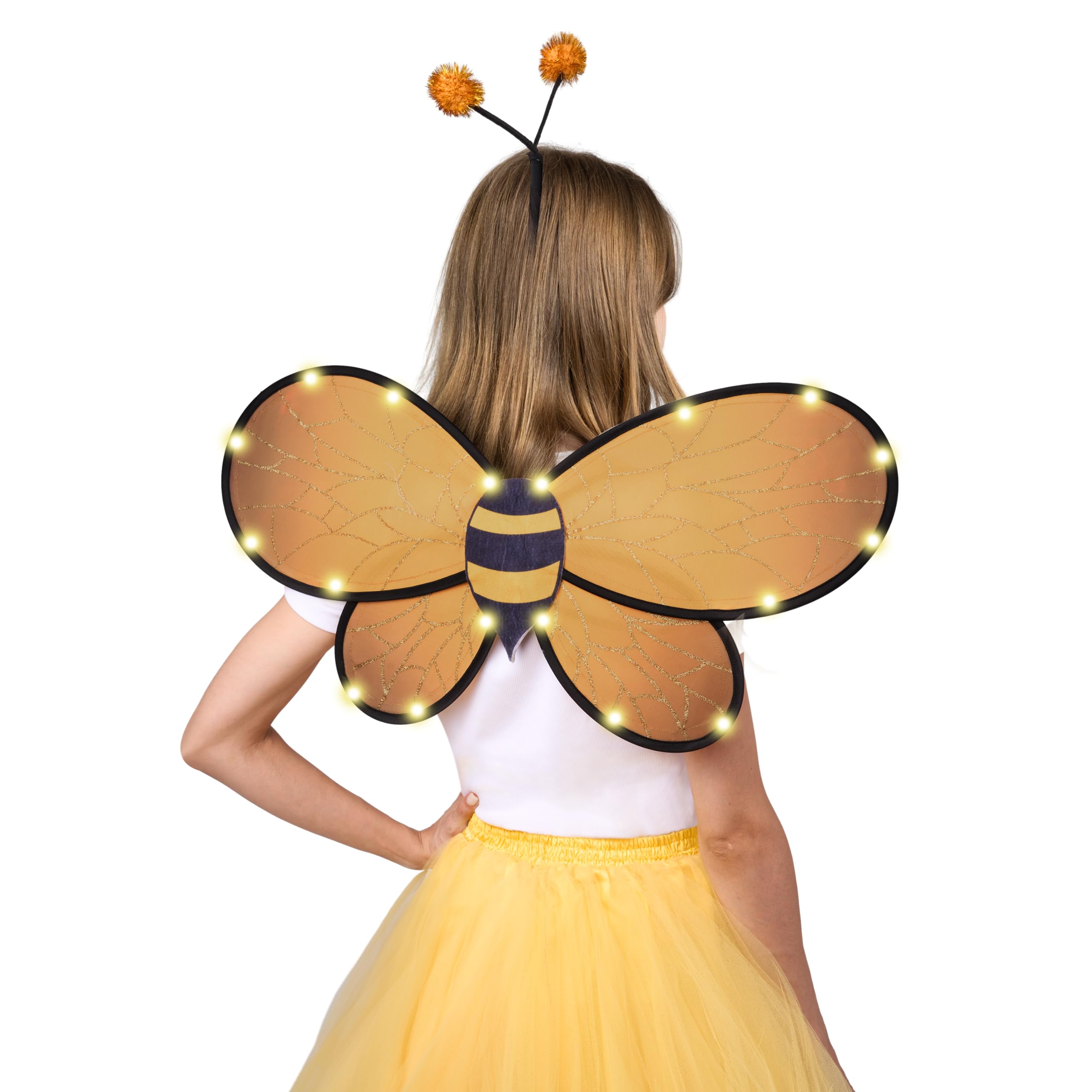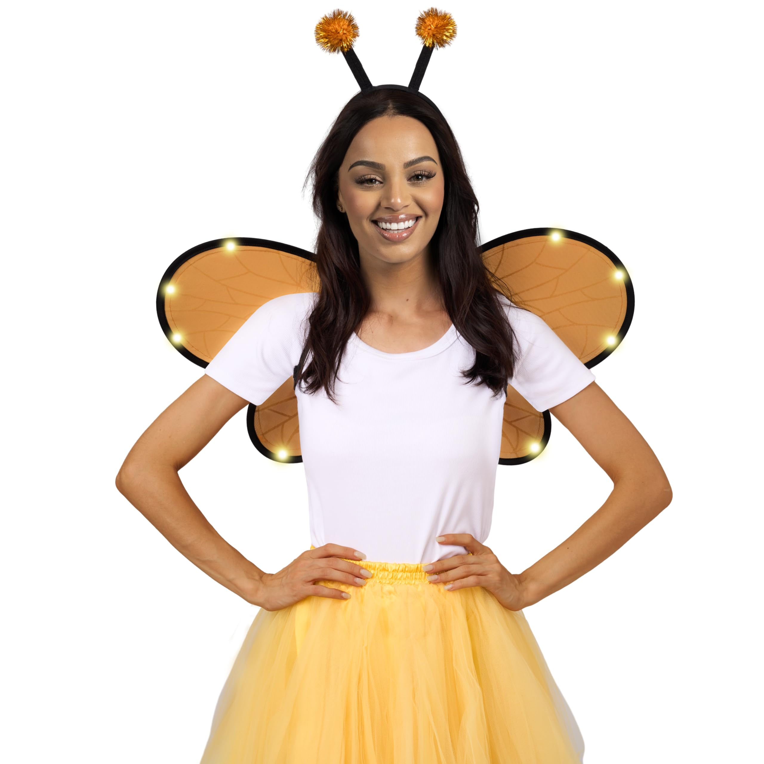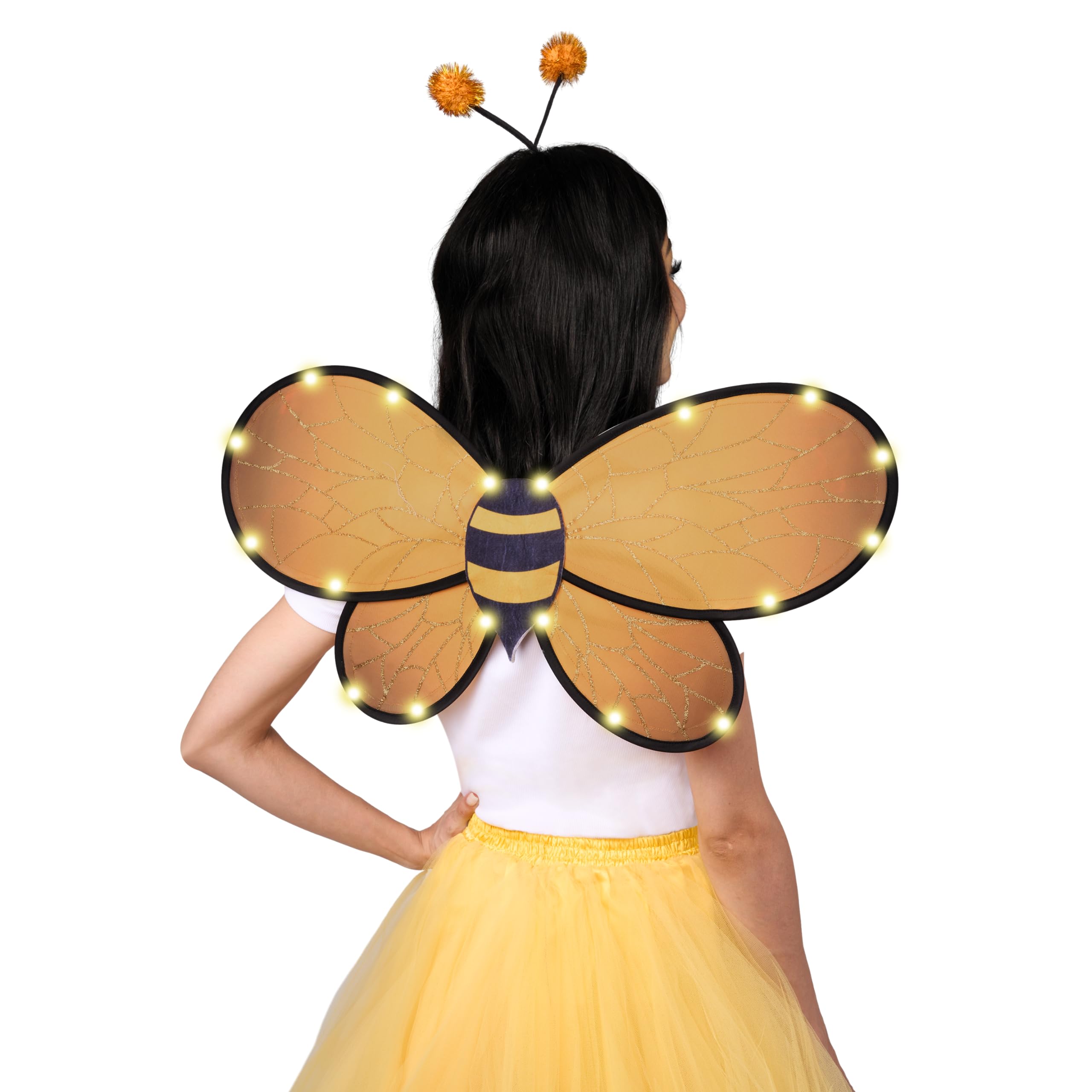 SUPER VALUE PACK: This black yellow bee costume set includes a pair of wings with built-in lights (batteries included) and a matching bee antenna headband, which are designed to fit women and girls of all sizes. Transform into a buzzing and radiant Bee with this captivating outfit.