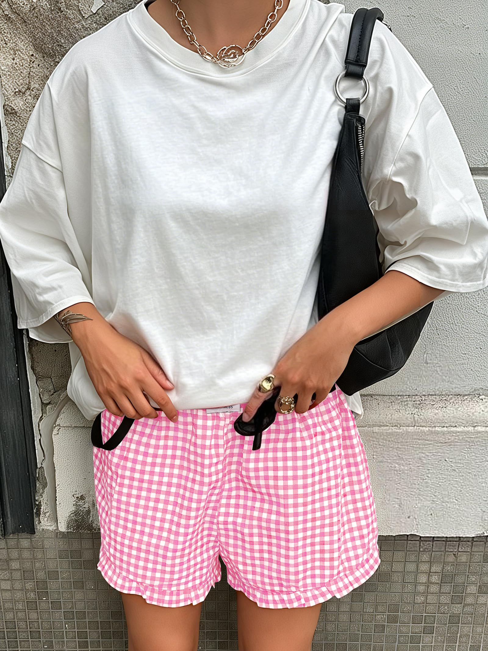 Material - 100% Rayon. Stretch - Non, Thickness - Thin, Softness - Medium. Machine wash cold gently with like colors. Do not bleach.Ironing temperature should not exceed 110°C. Our stylish high-waisted gingham lounge Shorts for spring summer and autumn! Featuring a plaid and stretchy waistband, pair them with your favorite crop tops, sweaters, or tees to rock the perfect trendy girl look.