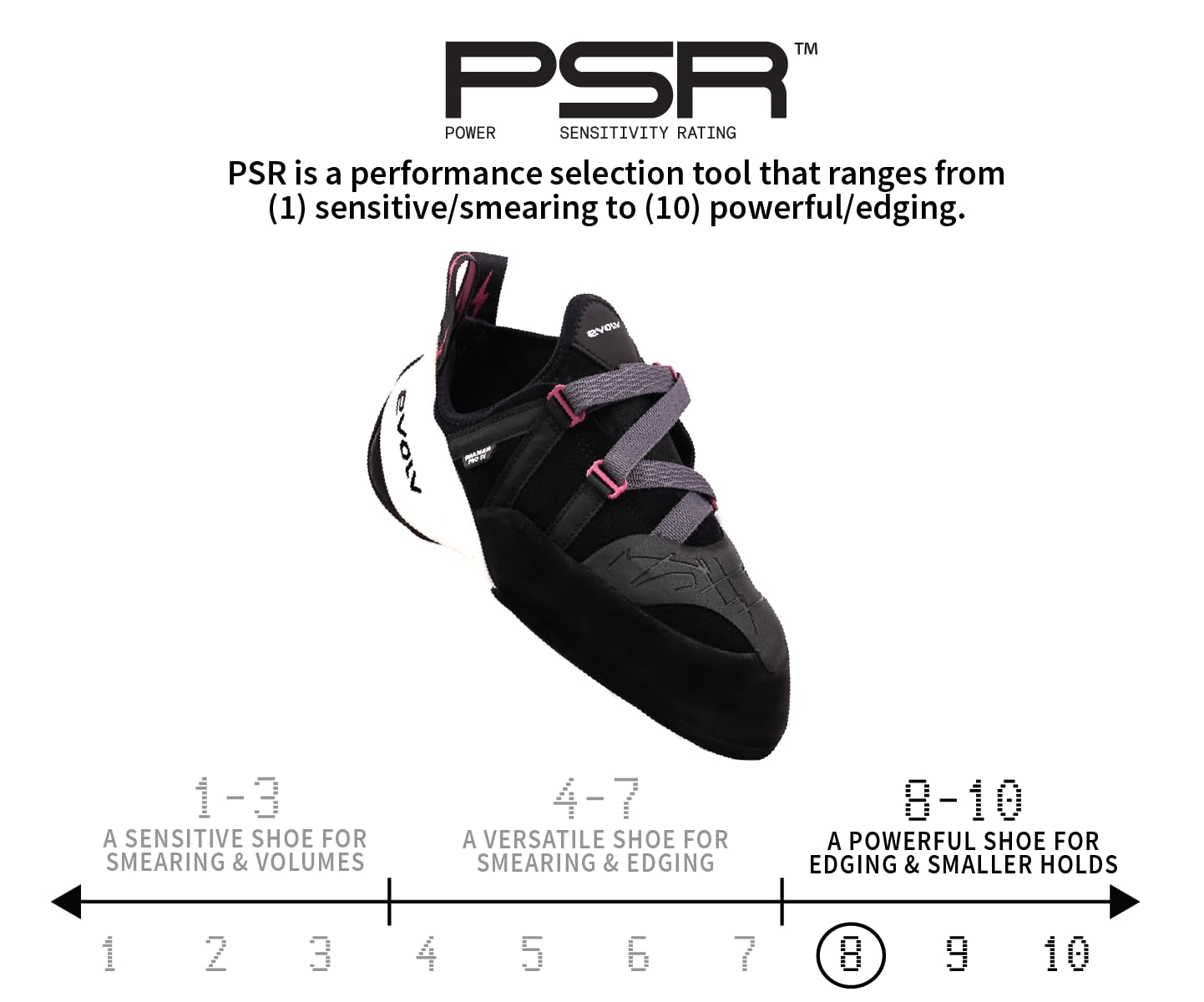 PSR is a rock shoe selection tool that ranges from (1) sensitive/smearing to (10) powerful/edging. PSR 1-3. Highly sensitive for smearing and volumes. PSR 4-7. Versatile for smearing and edging. PSR 8-10. Powerful for small holds.