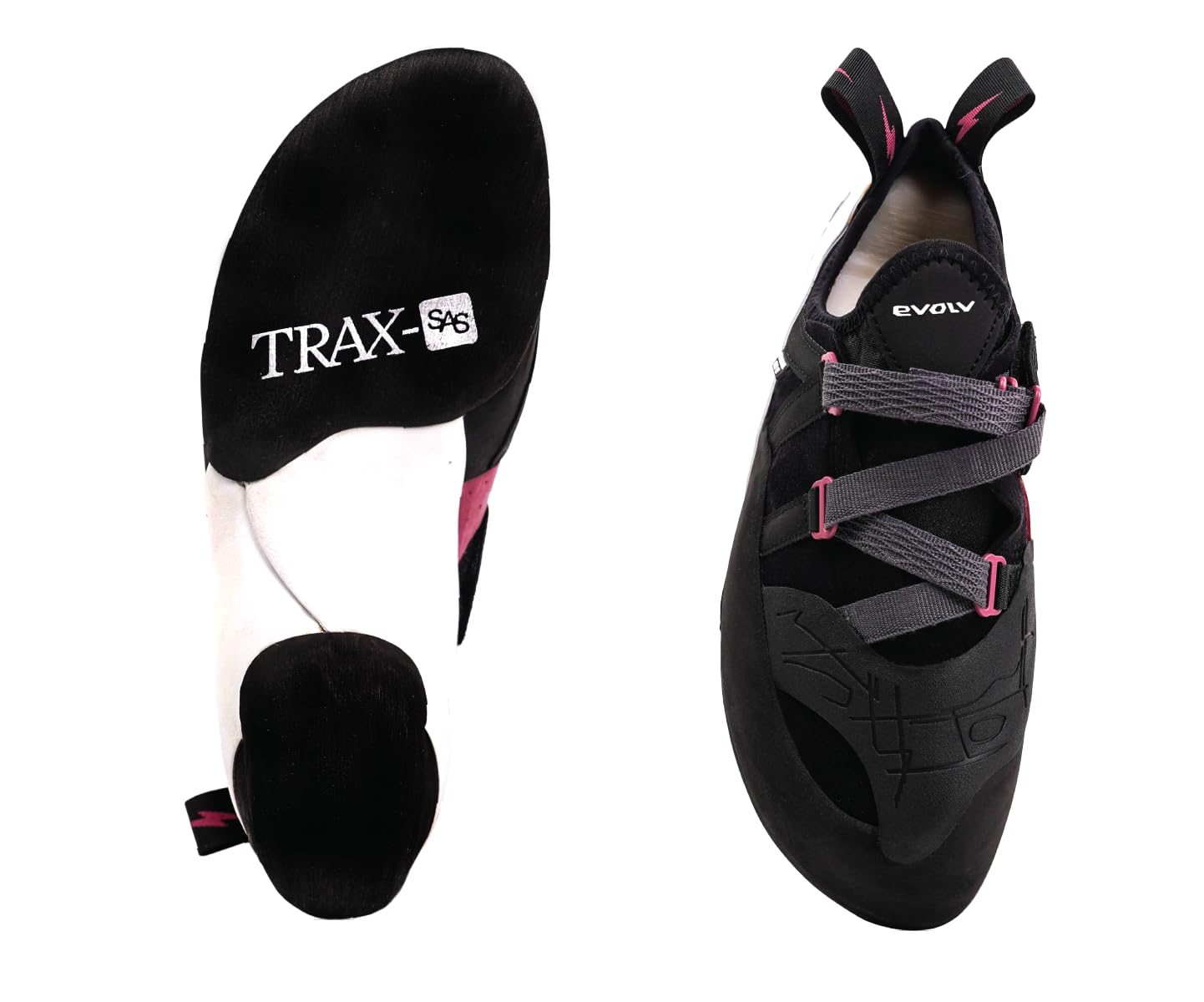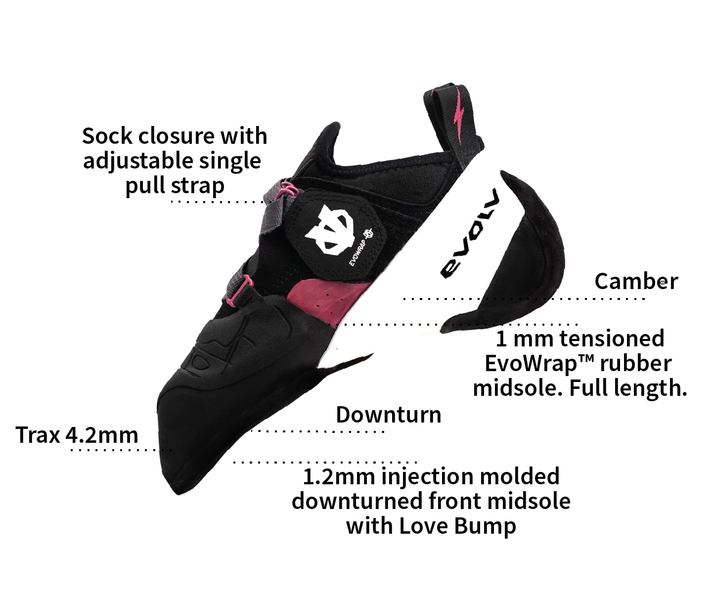 Description The Evolv Shaman Pro LV Climbing Shoe is a lower-volume version of the pro-level Shaman Climbing Shoe for comp climbers with narrower feet. It still features the same popular downturn that made the original Shaman so popular among boulderers and sport climbers. We made the midsole thinner for a more powerful shoe (PSR 8) that provides higher performance in the gym and on advanced boulder problems. It’s aggressive enough for tough boulder problems, and comfy enough for long sport routes. The Shaman Pro LV uses our EvoWrap technology which uses a tensioned 1 mm rubber midsole across the entire midsole. This active tension creates more power without reducing sensitivity. Complete with a 4.2mm TRAX SAS rubber outsole, the Shaman Pro LV has the power and sensitivity required for onsighting everything come comp day.