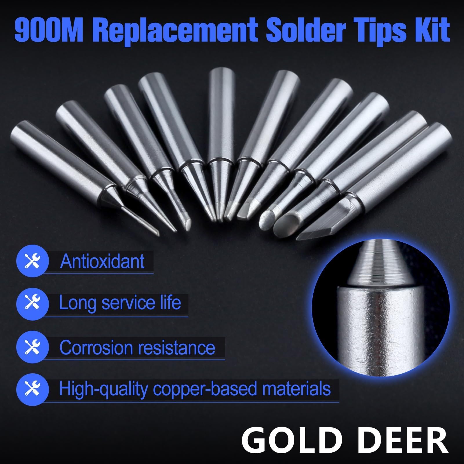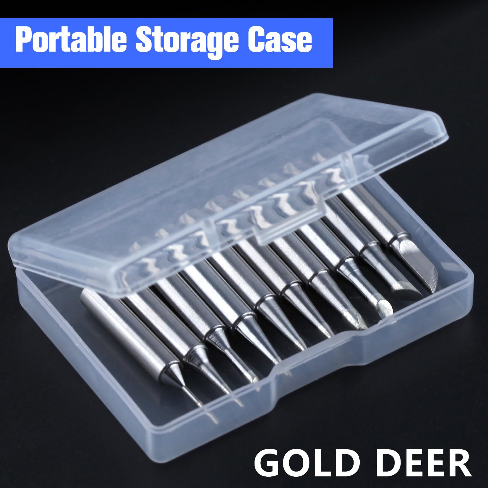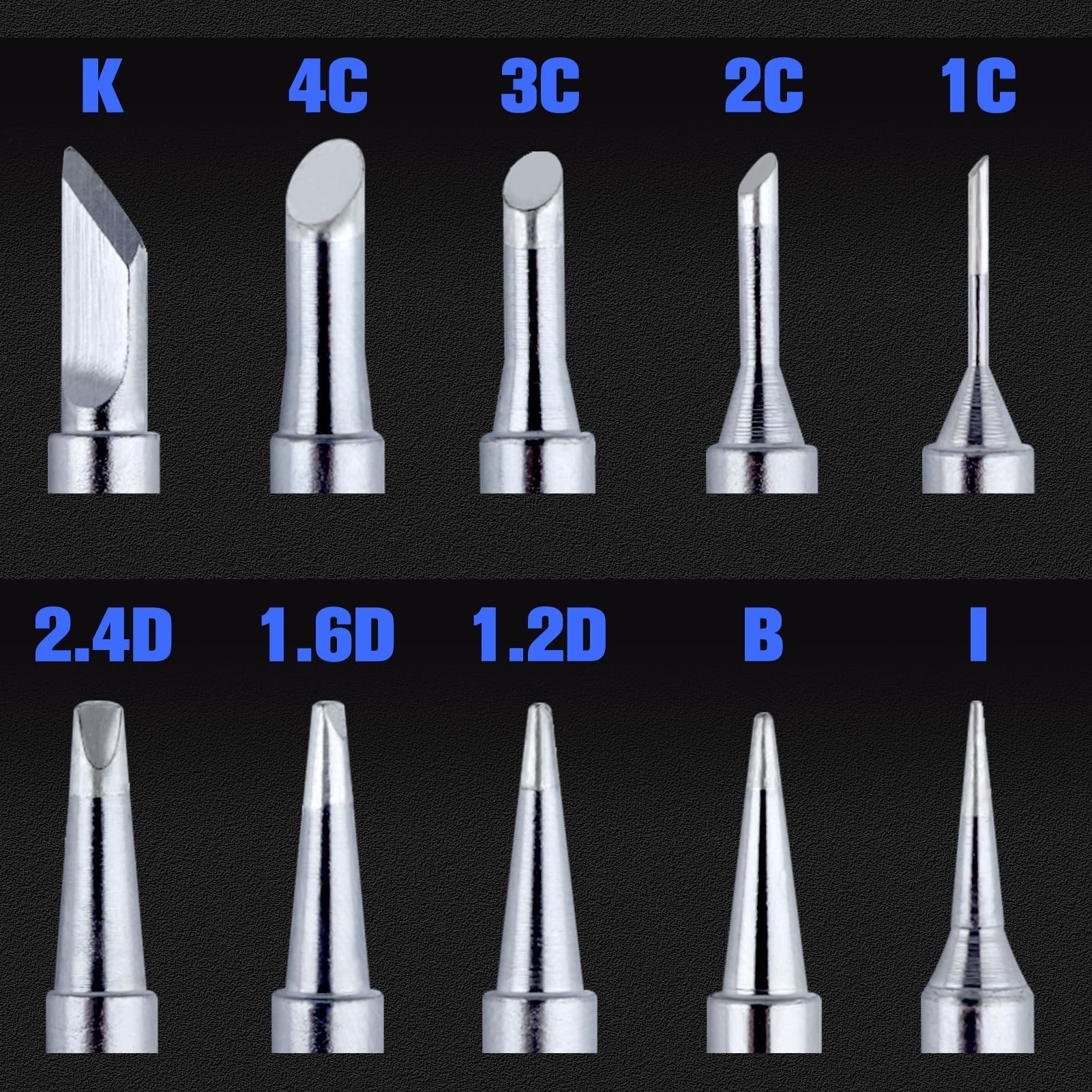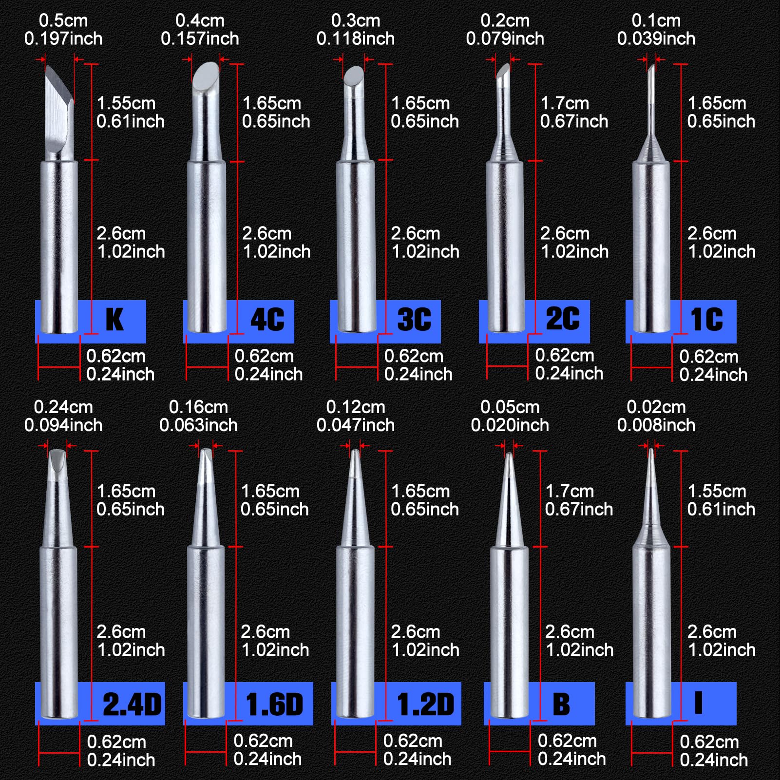 Package Include:Ten different shaped tips 900M-T-I, 900M-T-B, 900M-T-K, 900M-T-1.2D, 900M-T-1.6D, 900M-T-2.4D, 900M-T-1C, 900M-T-2C, 900M-T-3C and 900M-T-4C are available to meet virtually any soldering application required.