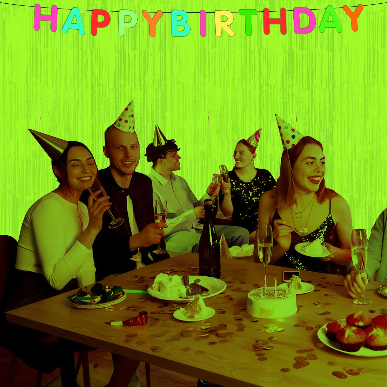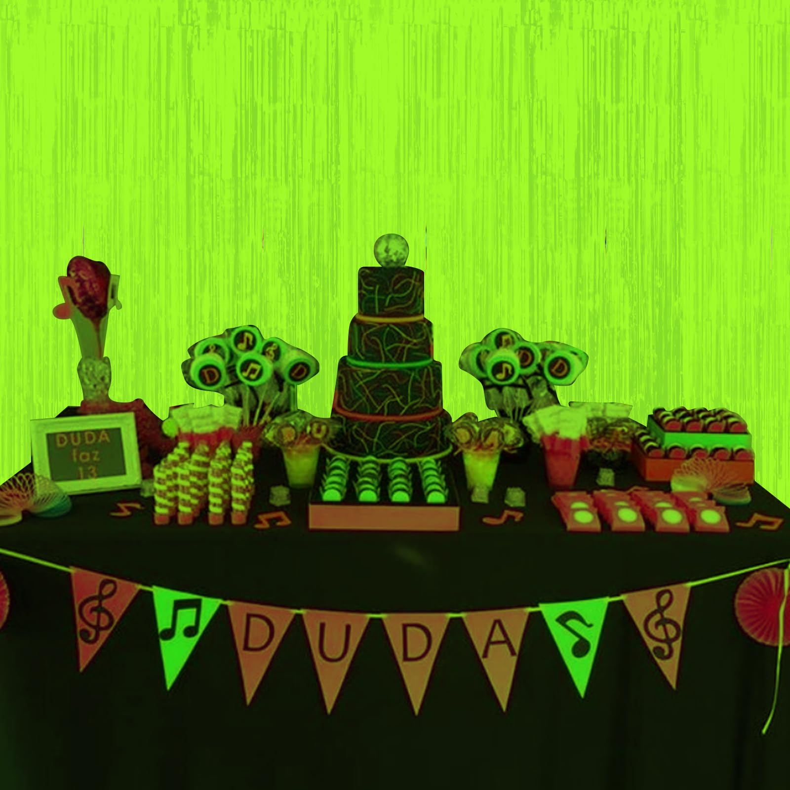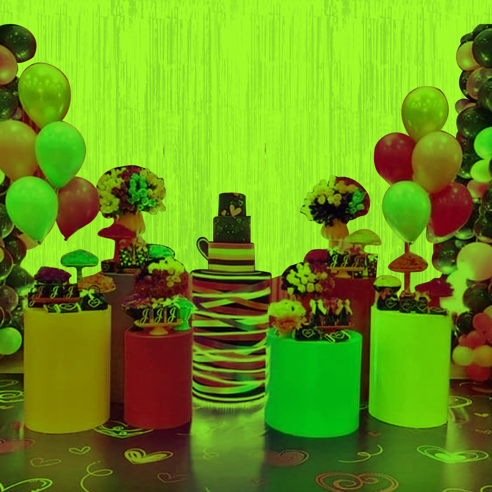 What’s Inside: Included in the package are 3 yellow glow in the dark foil fringe curtains, each measuring 3.3 x 6.6 ft, making them suitable for decorating most scenes. Perfect for creating an impressive neon backdrop for neon birthday party decorations and glow in the dark party supplies