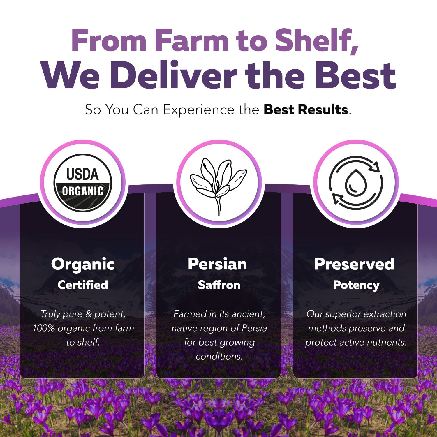 ORGANIC CERTIFIED SAFFRON: Enjoy the purity of our 100% organic saffron supplement sourced directly from traditional Persian farms. From farm to shelf, our ingredient is truly pure and potent for your wellness.