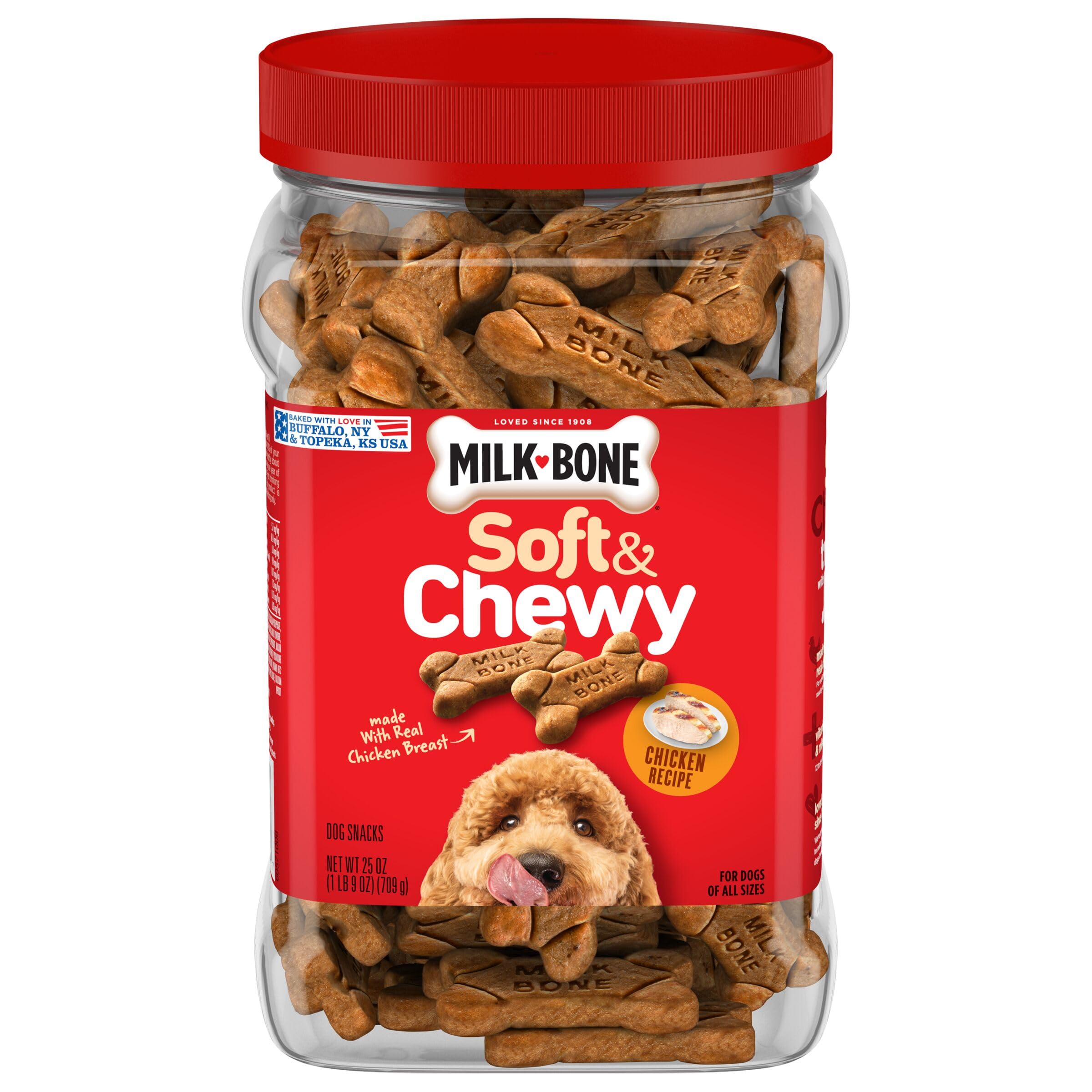 Contains (1) 25 ounce canister of Milk-Bone Soft and Chewy Beef and Filet Mignon Recipe with Chuck Roast dog treats and (1) 25 ounce canister of Milk-Bone Soft and Chewy Chicken Recipe with Chicken Breast dog treats
