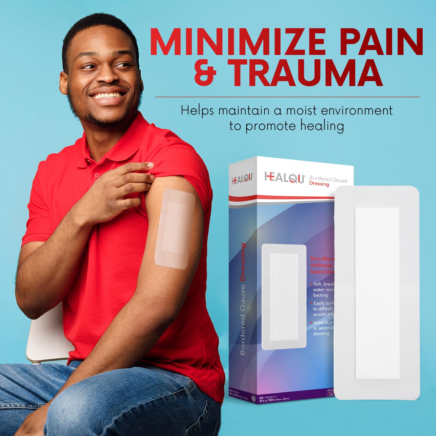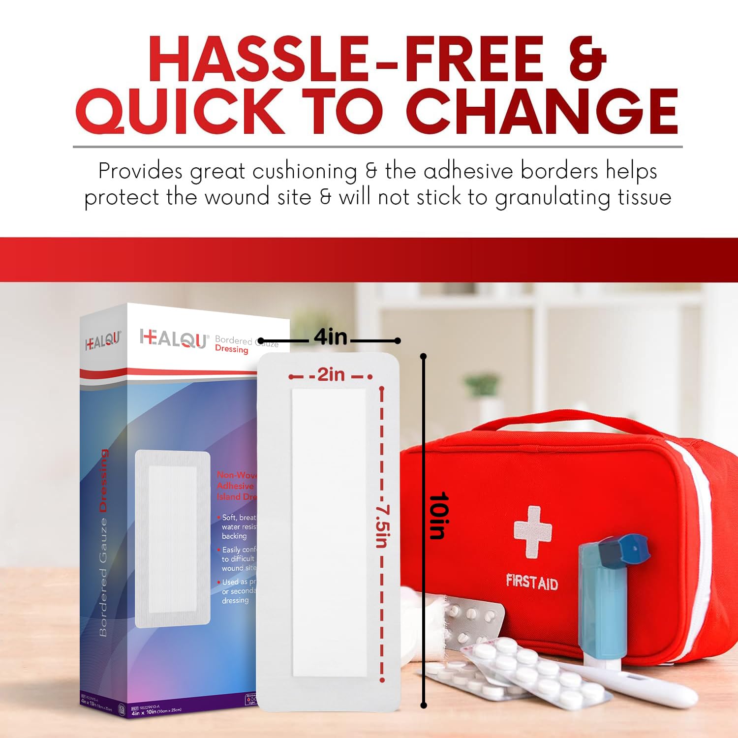 QUICK & EASY TO USE! Sticky around the edges but not in the middle, Healqu Bordered Gauze Island Dressings protect fresh cuts and scrapes without sticking to the wound, for good protection while healing. Simply peel & stick, and get on with the rest of your day!