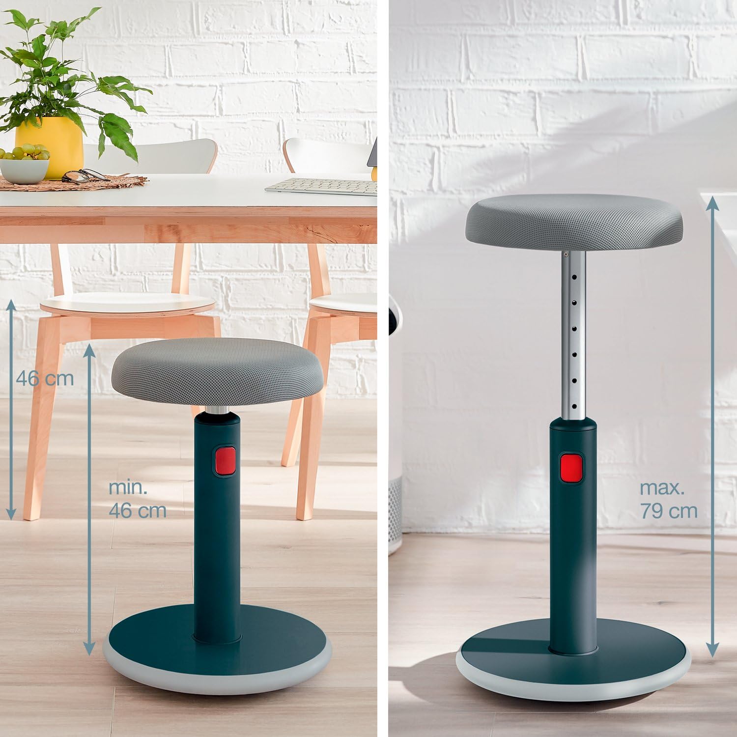 The Leitz Ergo Active Sit Stand 2 in 1 Stool allows the flexibility to move between sitting and standing while you work, encouraging muscle movement, maintaining proper posture, and increasing energy levels. 2 in 1 stool can be adjusted to the perfect sitting height similar to an office chair but also to a perfect standing support height with a significant higher range than other standard stools. Features a rounded base to encourage active movement by swiveling and rocking while you work to strengthen your back. The height can be easily adjusted between 18" - 31" (46 -79 cm) and the standing stool will remain strong and stable at any height. Comfortable and practical, this ergonomic stool has a breathable, 3D air mesh-covered foam seat and a non-slip base which will not damage your floor. With its minimalist design and matte finish colors, this stylish standing desk stool will promote health and wellbeing by effortlessly creating the perfect active working set-up. Limited warranty. Plastic free packaging. Combine with other Leitz Ergo products for an inviting and flexible workspace that keeps you moving all day.