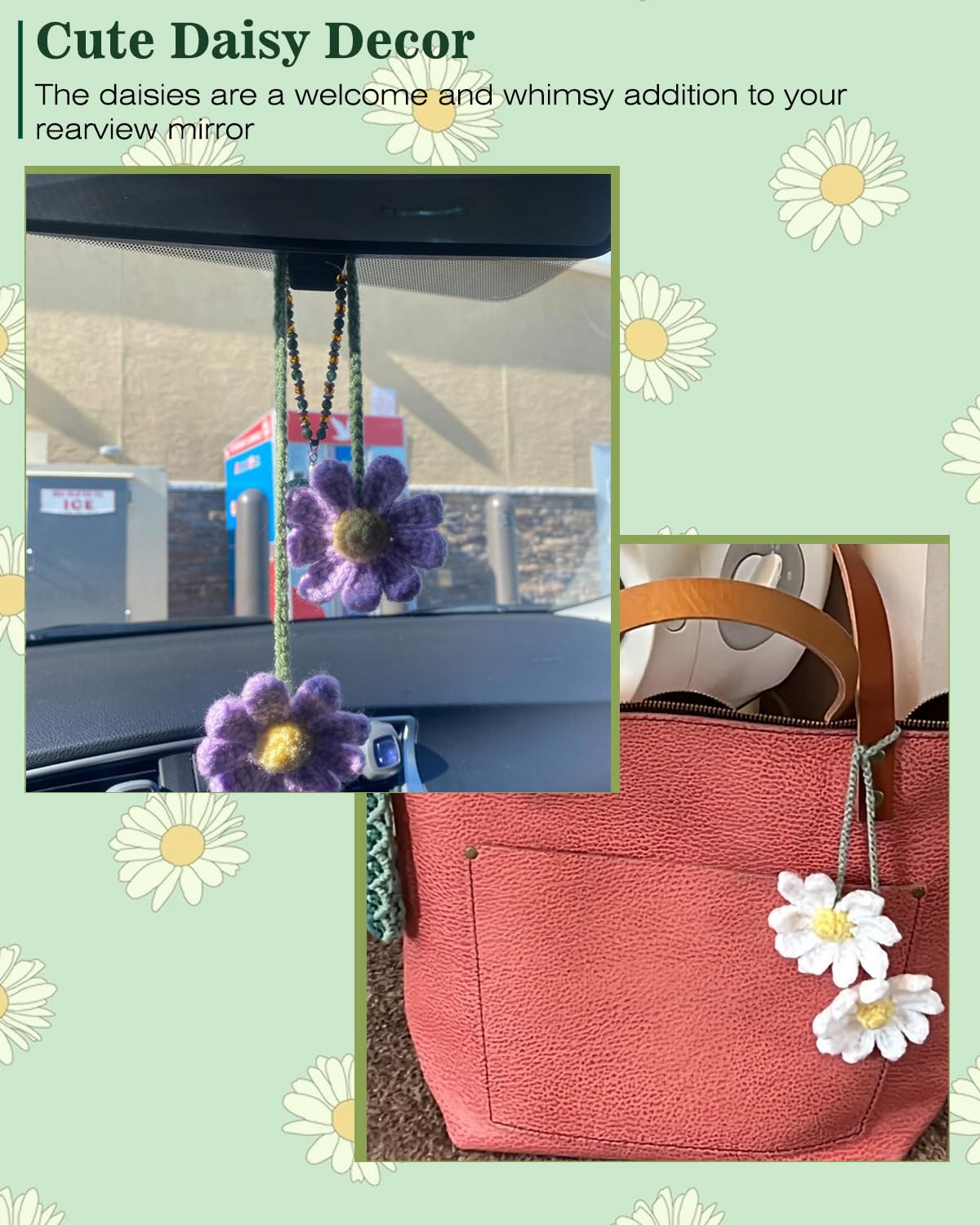【Cute Daisy Decor】The perfect way to add a touch of floral charm to any space. These versatile daisy decorations can be hung anywhere to add a pop of colour and freshness to your living space,whether it be in your bathroom, on your rearview mirror, or even on your tote bags.