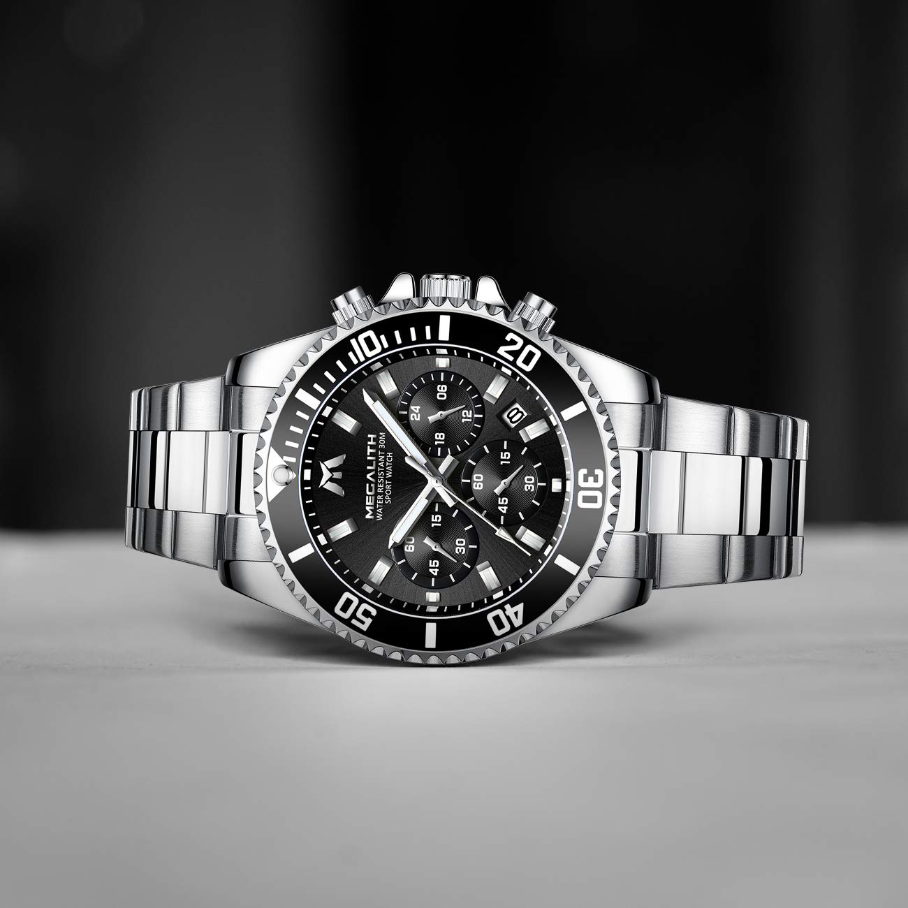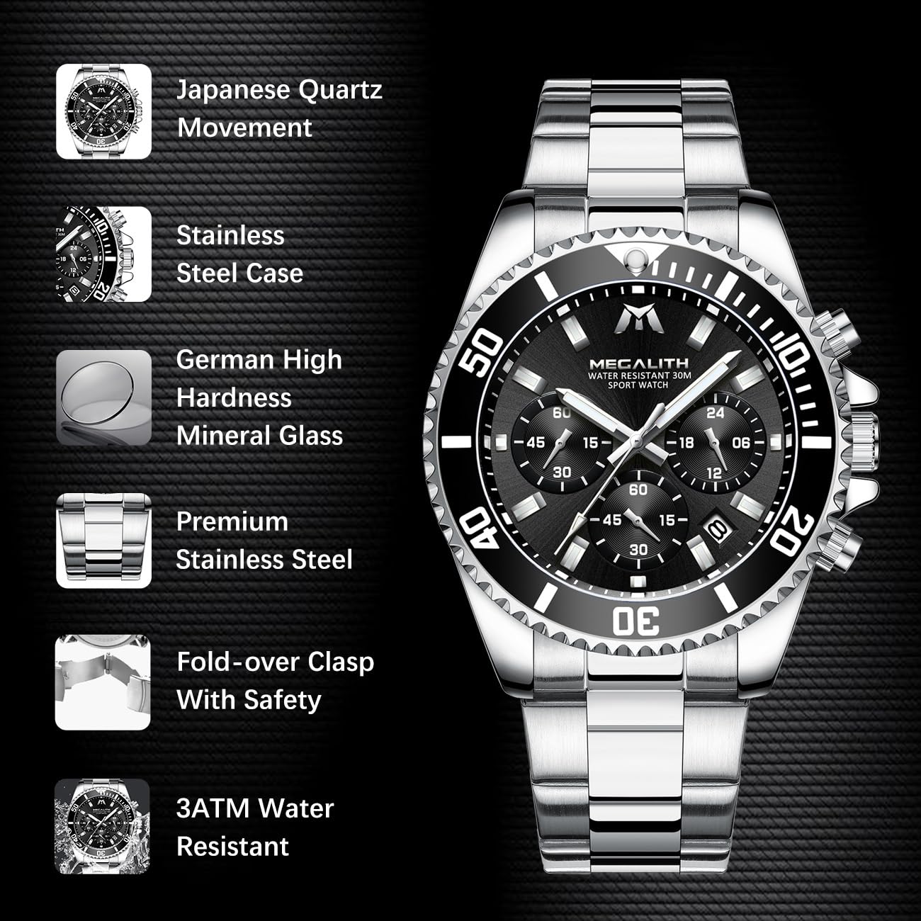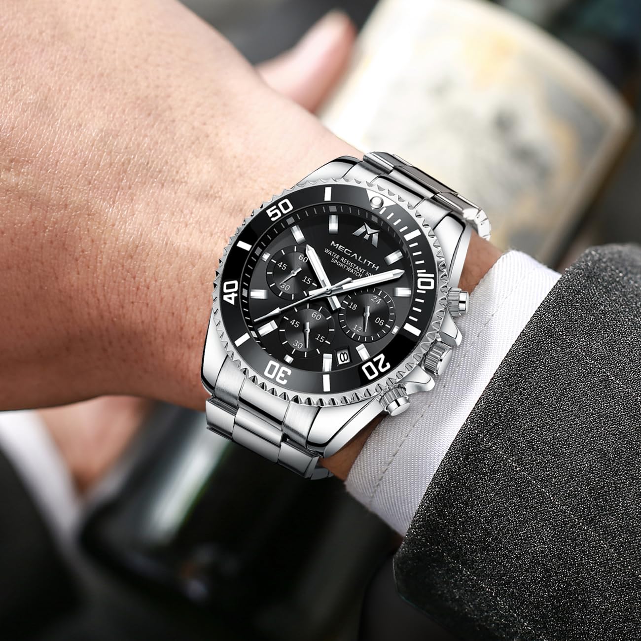 MEGALITH Mens Watches with Stainless Steel Waterproof Analog Quartz Fashion Business Chronograph Silver Watch for Men, Auto Date