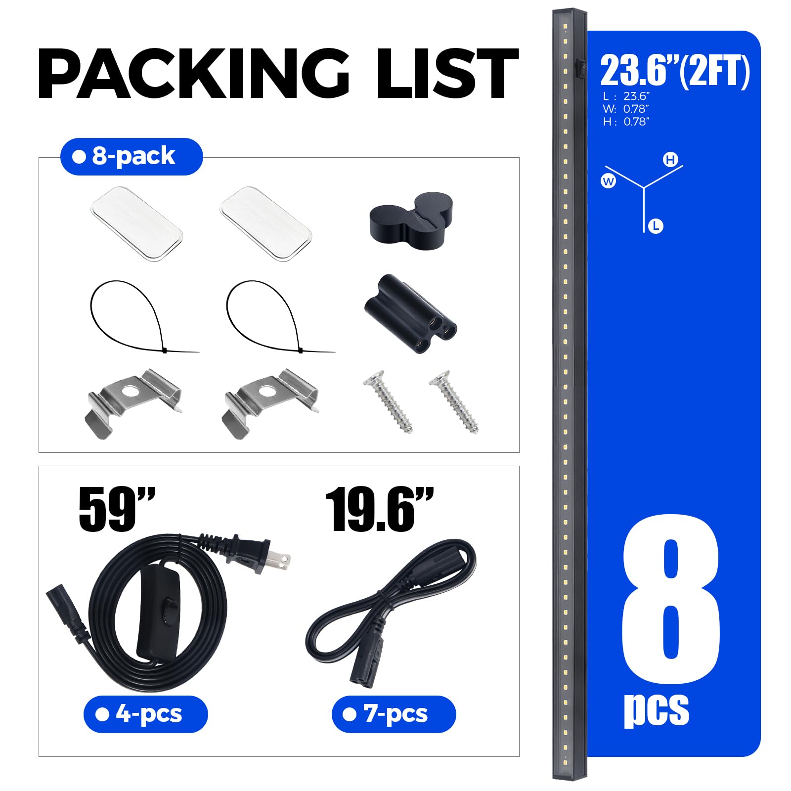 What You Get: 8 x Barrina T5 Grow Lights, 4 x Power Cords with ON/OFF Switch, 7 x Connecting Cords (20''), 8 x Small Connectors, 16 x Installation Clips, 16 x Magnetic Bars with Double-Sided Tape, 16x Cable Ties, 8 x Dustproof Cap