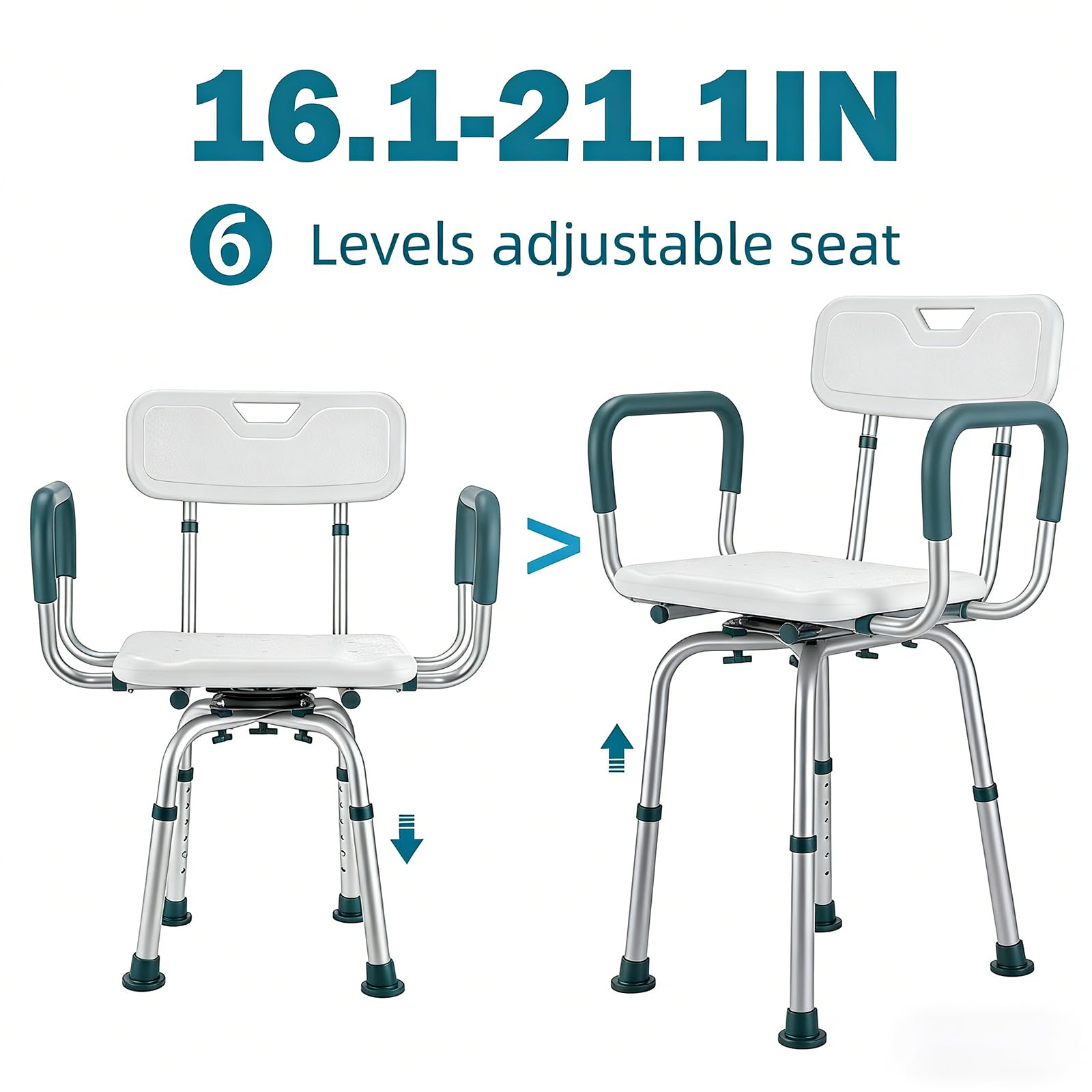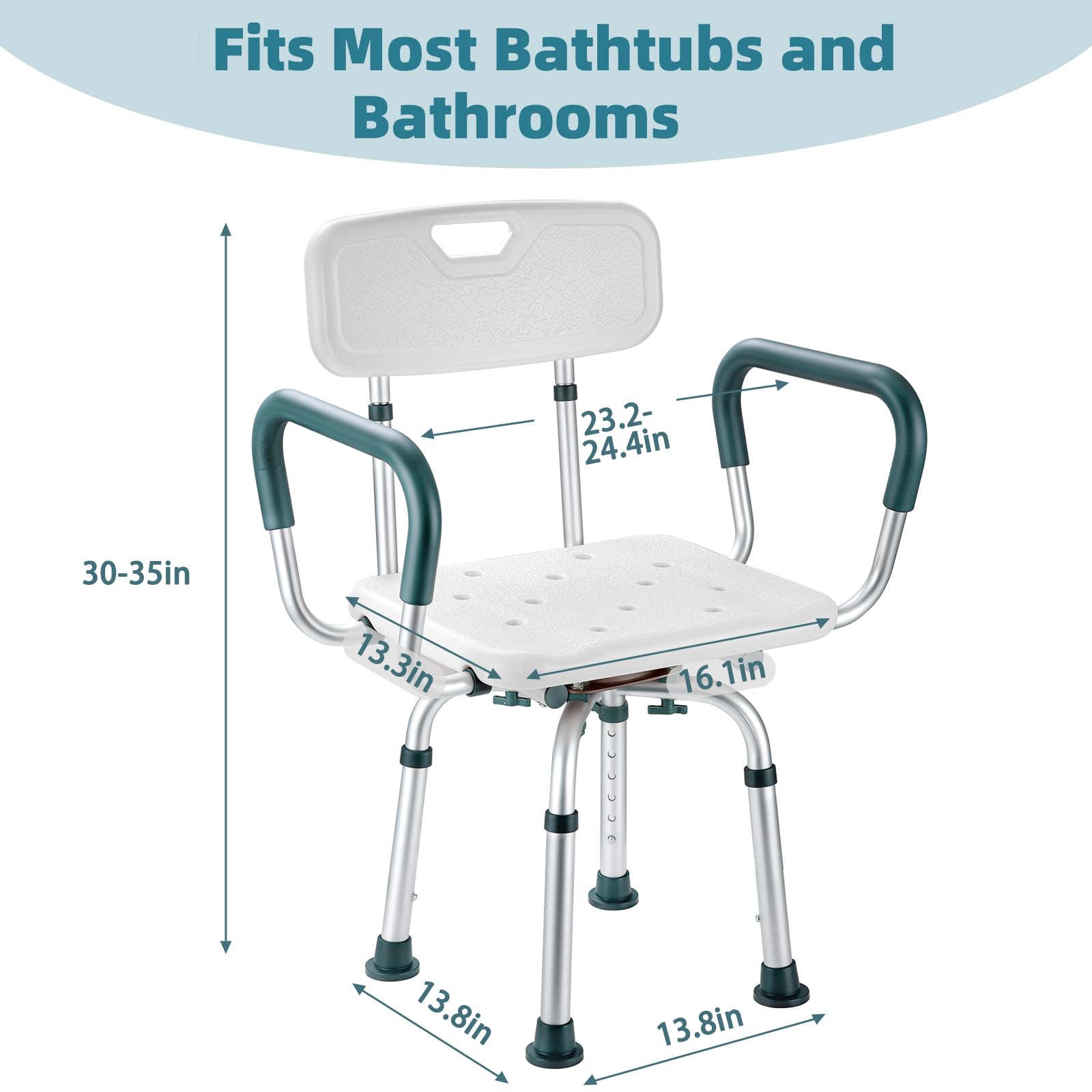 Removable Wide-Arm Support: Designed as a Shower Chair for inside shower use, this model features a shower chair with removable arms and back for effortless access and customization. Its adjustable seat width (up to 24.4 inches) provides ample space, while the contoured backrest ensures all-day comfort for diverse body types. Perfect as a swivel bath stool for elderly and disabled adults, it combines stability with versatility for safe bathing.