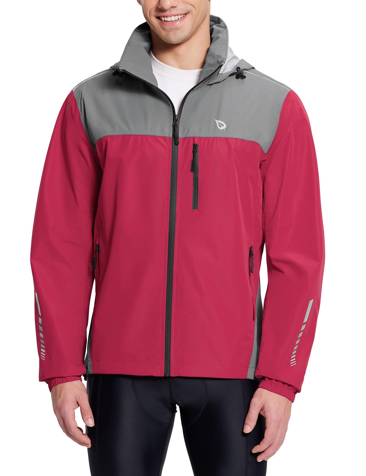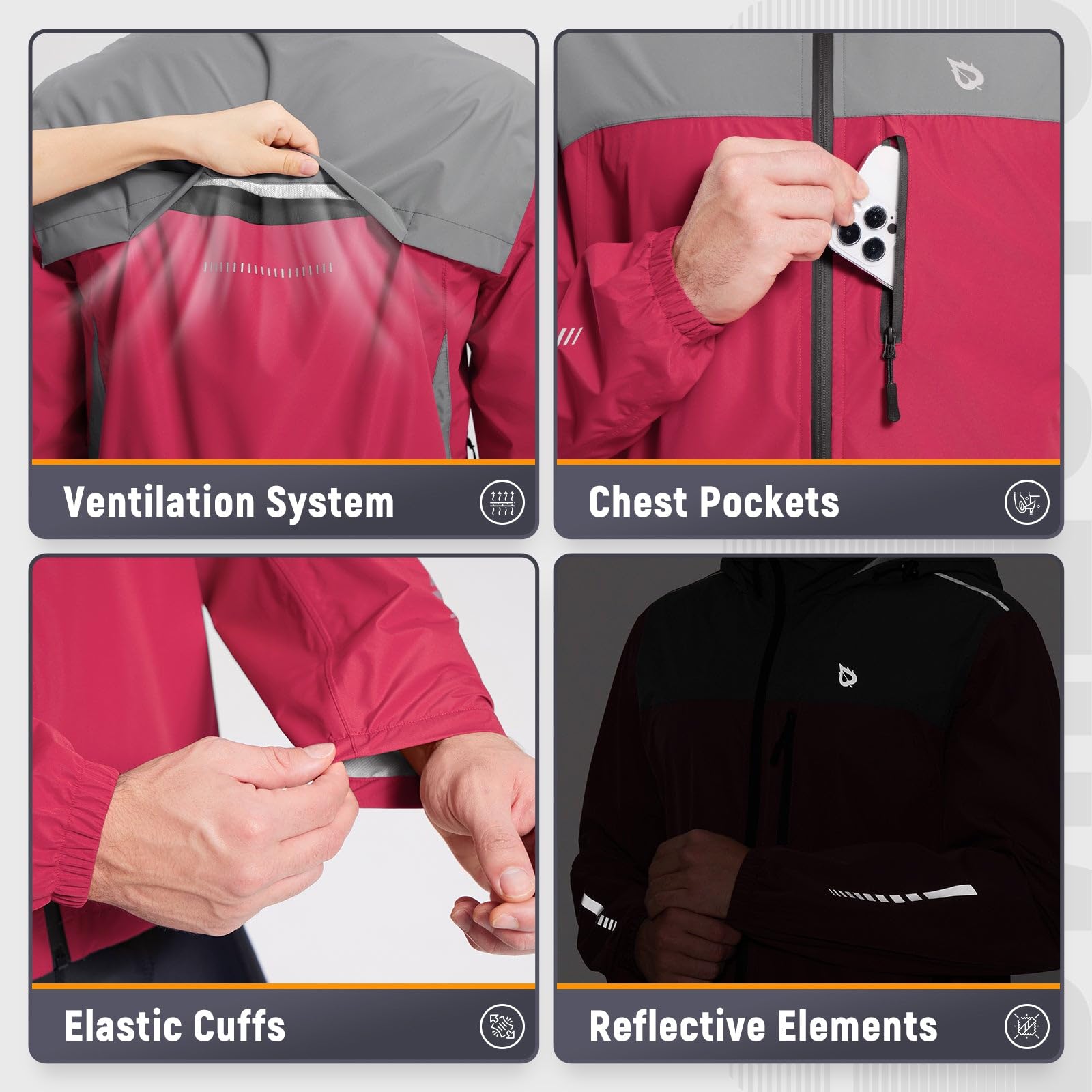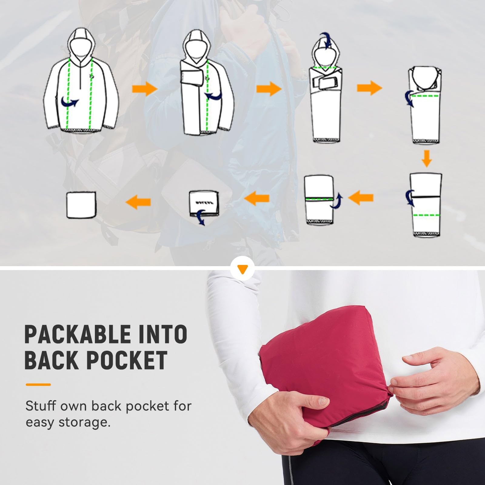 Packable Hood: Mens cycling rain jackets with hood features drawstring, large enough to accommodate road riding and climbing helmets. The hood can be tucked into a velcro compartment by the collar when not in use.
