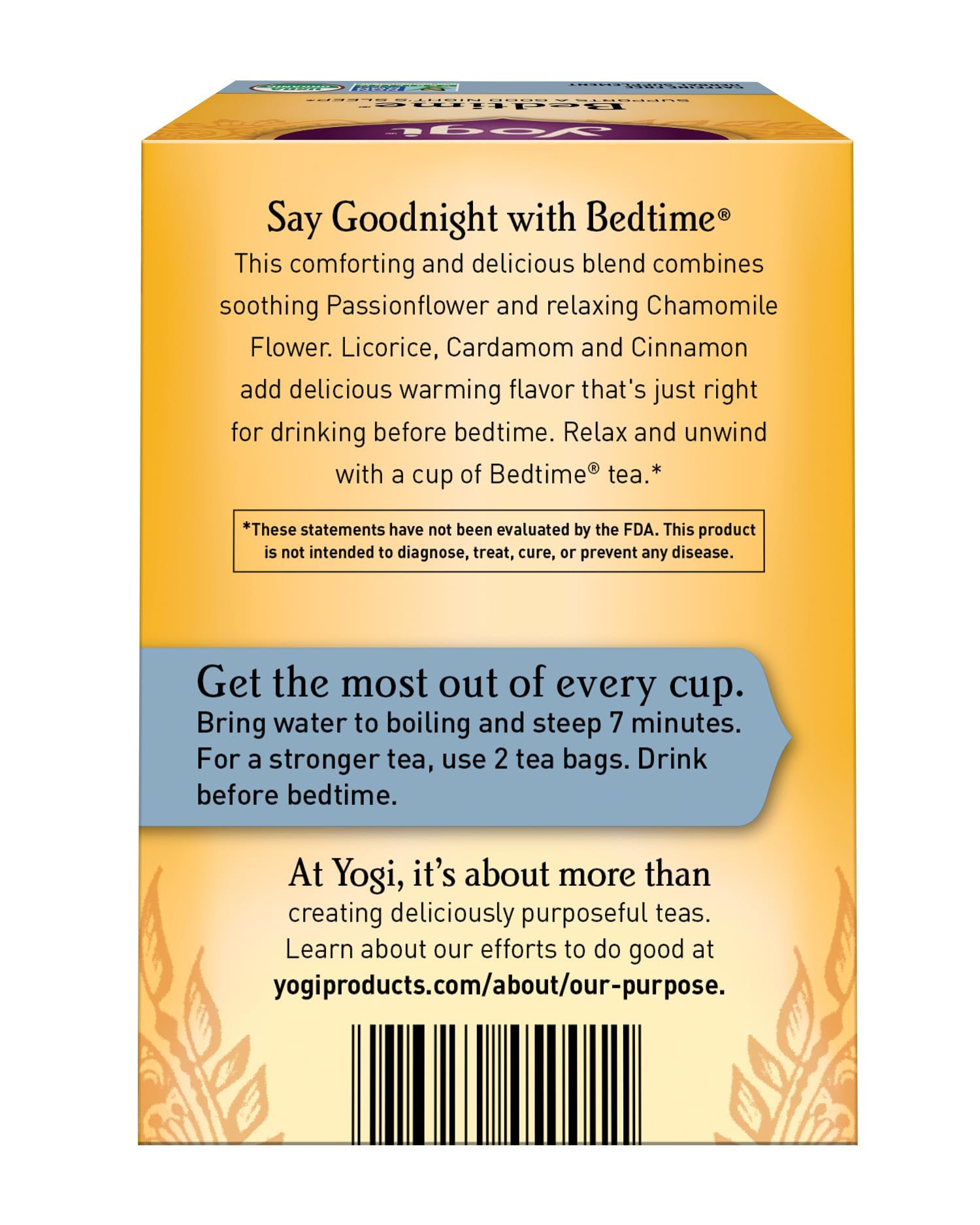 Yogi Bedtime tea is a comforting and delicious sleep tea blend that combines soothing Passionflower with relaxing Chamomile Flower. Licorice, Cardamom, and Cinnamon add delicious warming flavor to this herbal tea, making it just right for drinking before bedtime. Relax and unwind with a cup of Yogi Bedtime tea.*
