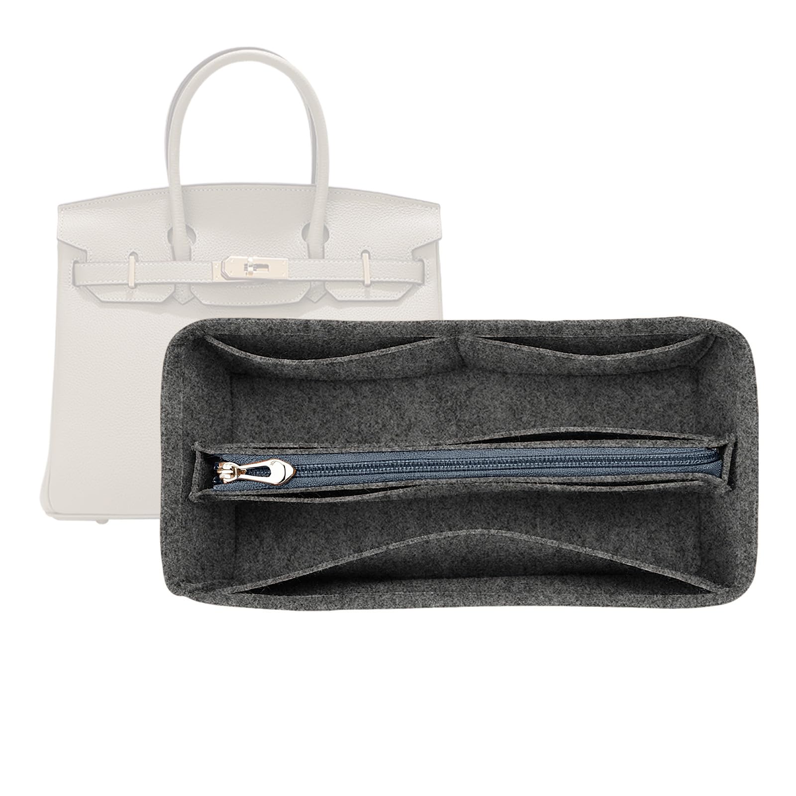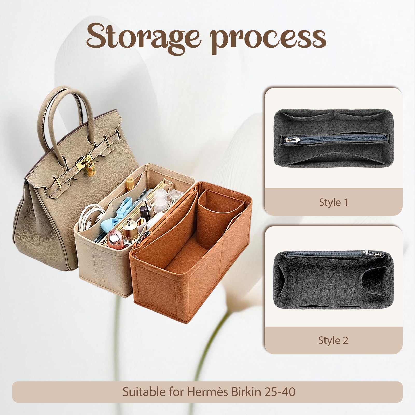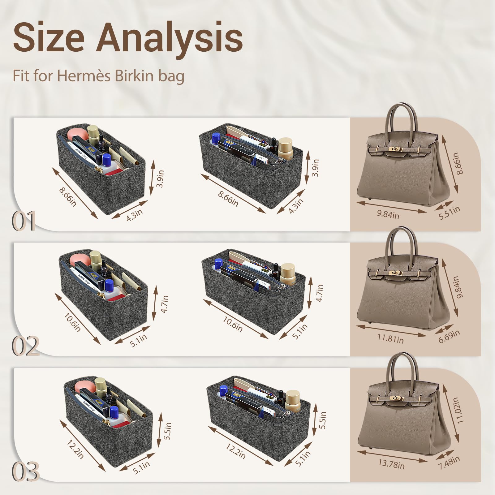 Organizer for Hermes birkin bag, size: Birkin 25 S = 8.66×4.3×3.9 (length× width× height) inches. Birkin 30 M=10.6×5.1×4.7 (length× width× height) inches. Birkin 35 L = 12.2×5.1×5.5 (length× width× height) inches. The lining of this bag is made of high-quality superfine fiber, which is more soft, comfortable, tough and durable.