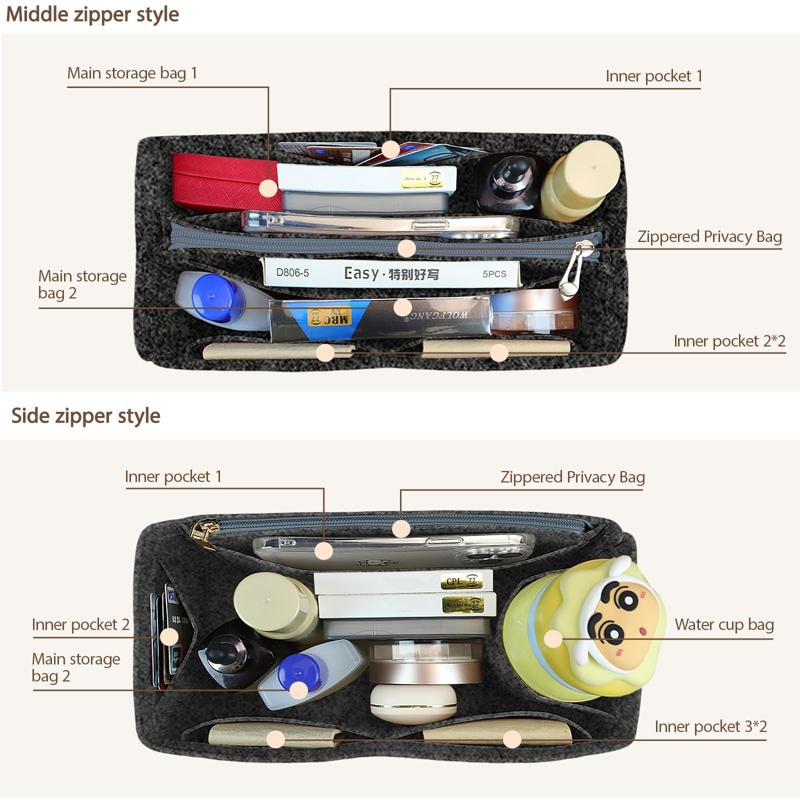 Purse Insert Organizer Save your time, bid farewell to messy bags, and prepare enough pockets for smart phones, keys, glasses, credit cards, cosmetics, etc, which will make the search more organized and easier. It is also a good way to keep your bags clean and tidy.