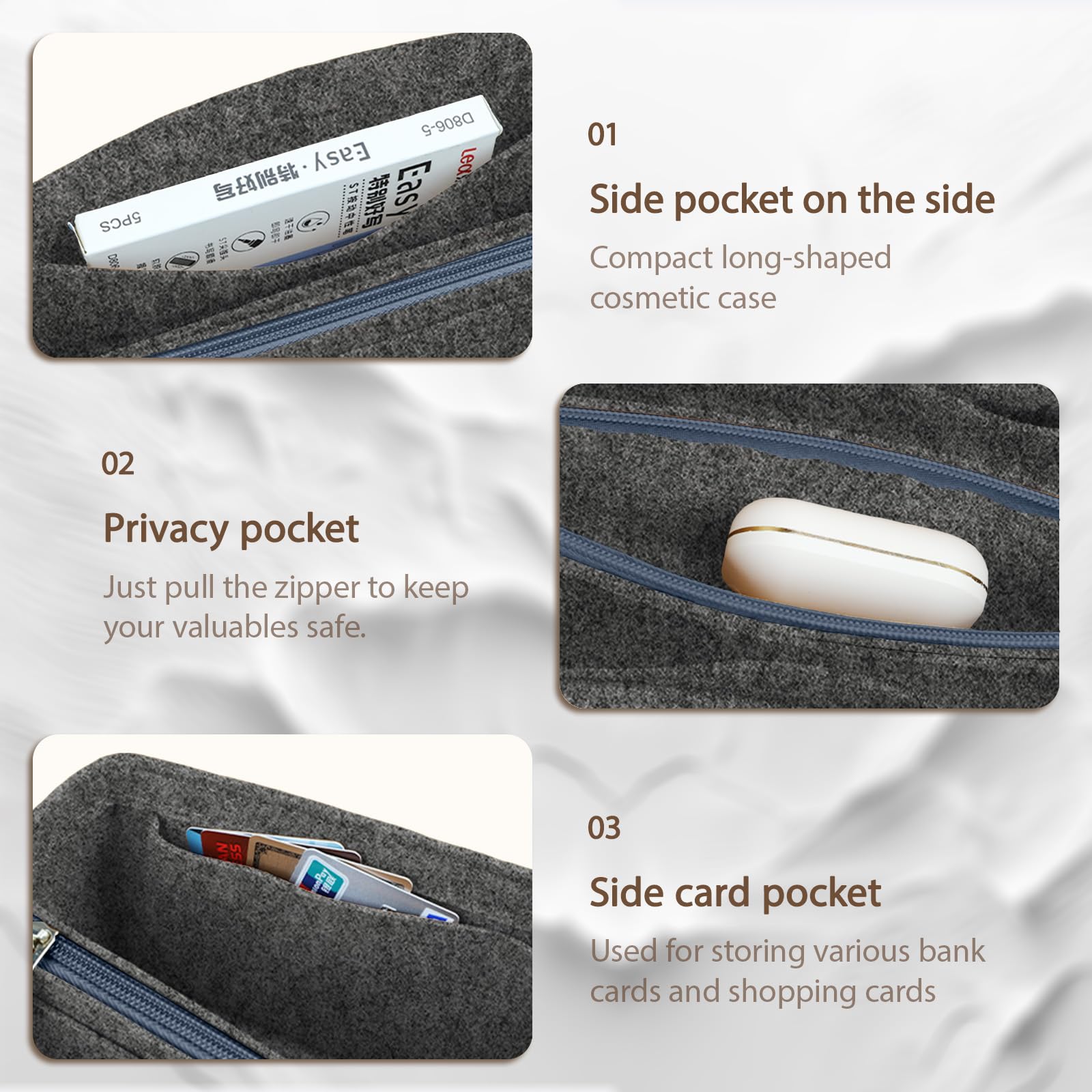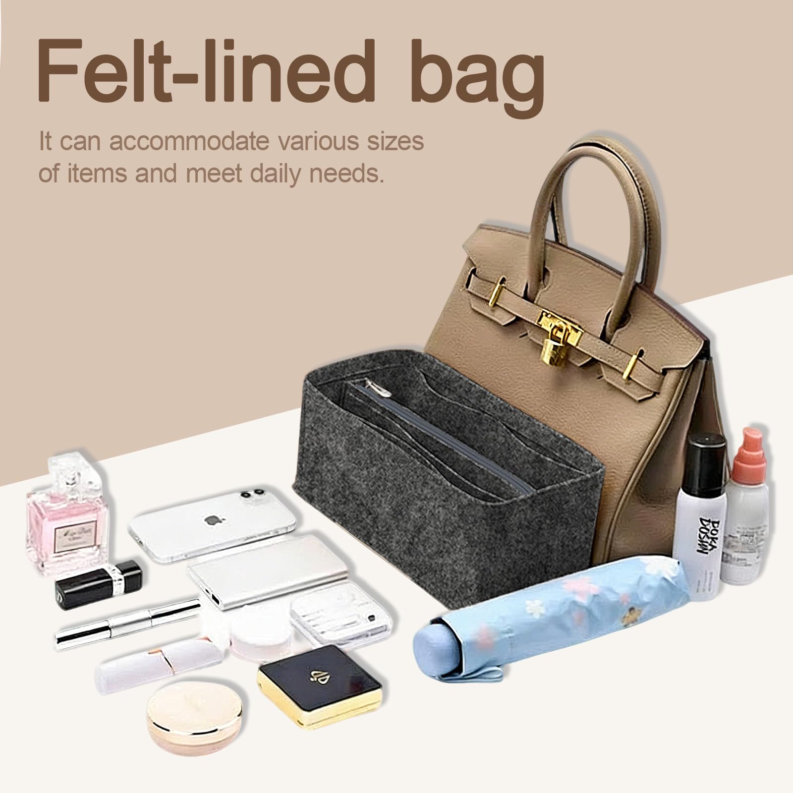 Felt Organizer Insert can not only keep your bag clean, but also protect your bag lining from being dirty and damaged, keep your shoulder bag beautiful and unchangeable, prolong the service life of your bag, and it is very suitable for perfect matching.