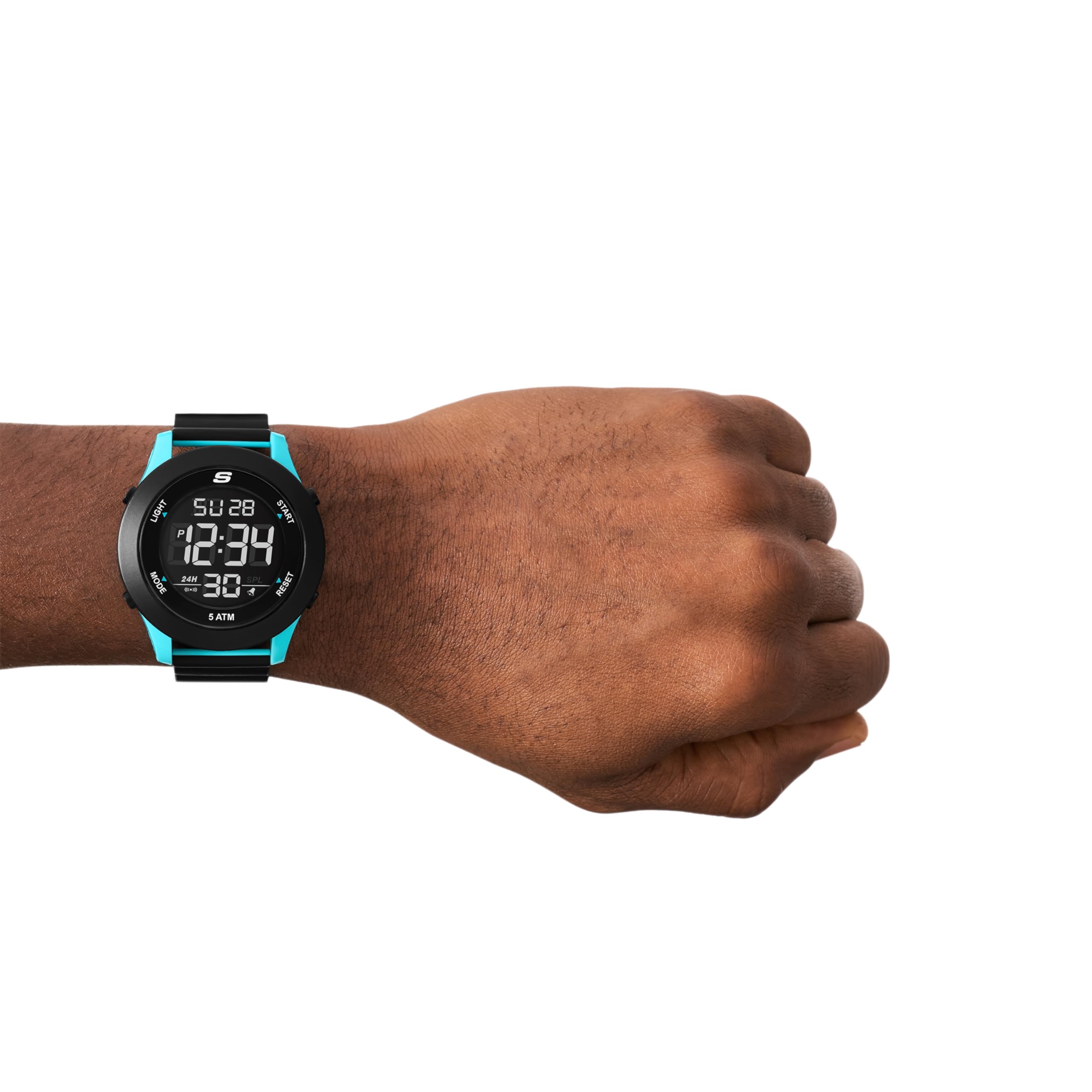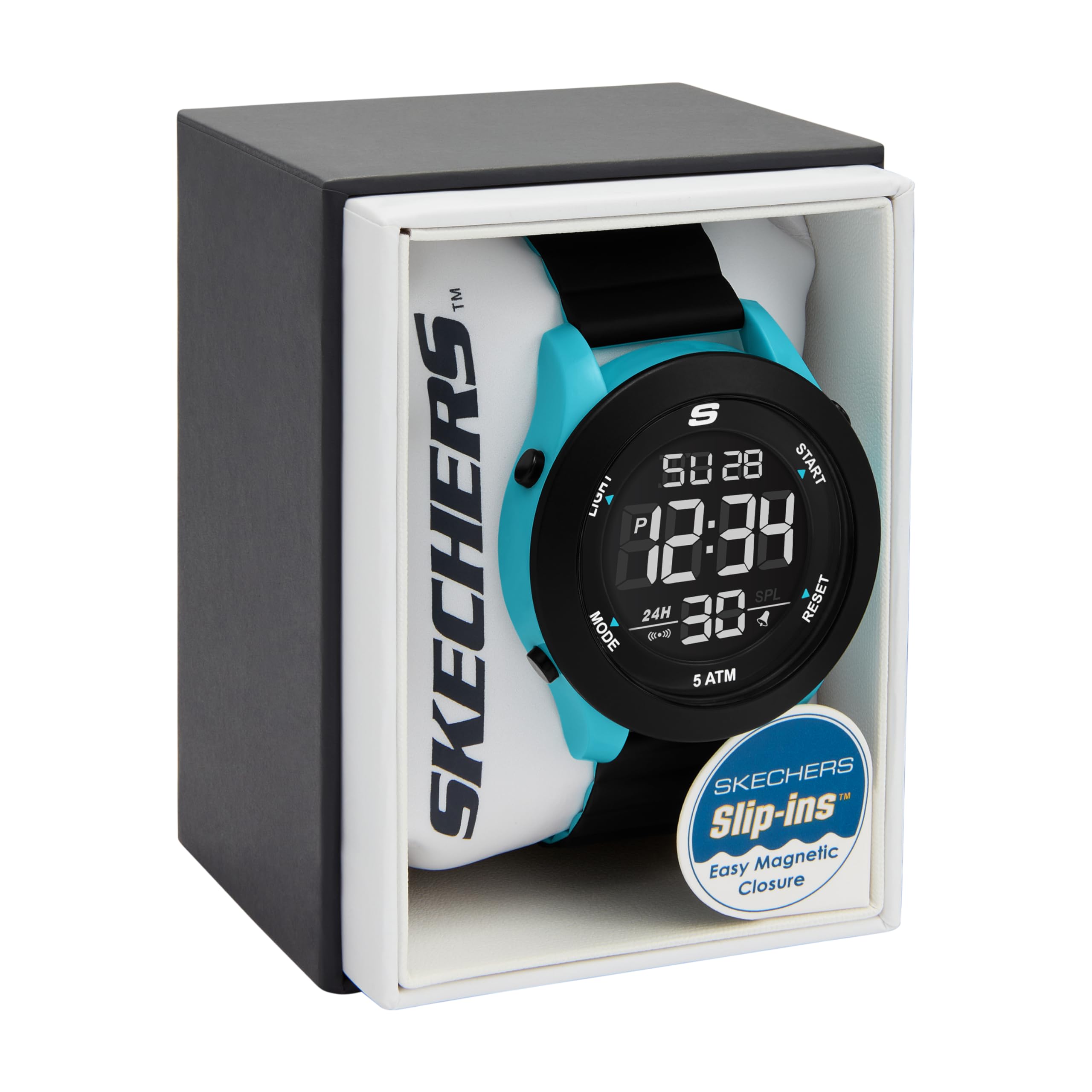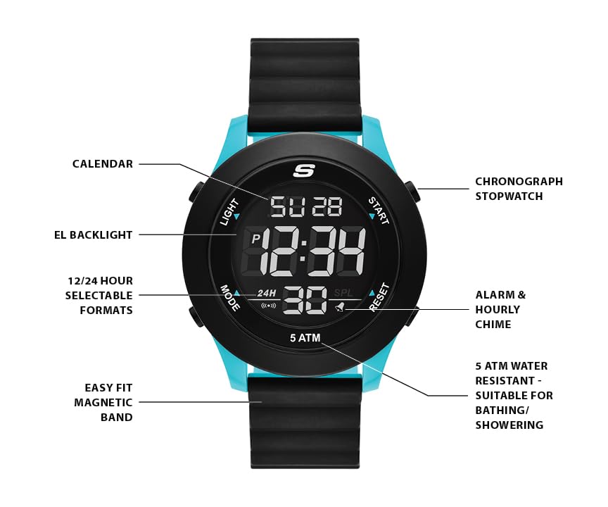 Making every moment a breeze, this Skechers Slip-Ins Rosencrans digital watch features an easy-on, easy-off dual-tone black and turquoise magnetic strap, black and turquoise plastic case and negative digital display. Additional functions include a chronograph stopwatch, 12/24-hour time format, a daily alarm with chime and EL backlight.