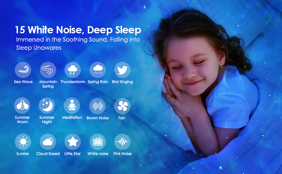 ✨【15 WHITE NOISE MACHINE NIGHT LIGHT PROJECTOR】The galaxy light projector with 15 popular white noise&soothing sounds can help you and your baby fall asleep more easily. Galaxy night light projector has 10 levels of volume which gently lulls yr babies into dreams! Idear for yr little one lie in bed looking at galaxy lights rotating & listening the soft music, galaxy projector soothes yr babies right to sleep! This galaxy projector for kids r mommy's best help,with this night light projector & music,kids can sleep alone now! When u try to fall asleep or meditate, these sounds can both relax and soothe.Whether kids or adults,you can enjoy this galaxy projector enjoying every peaceful night.