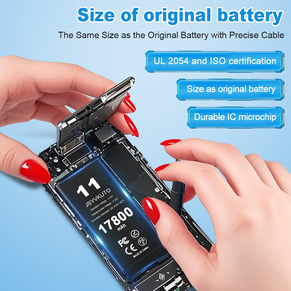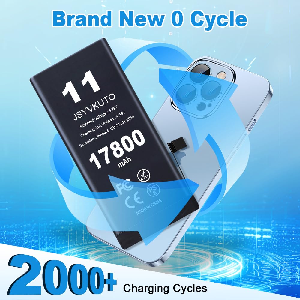 【New Super Capacity】 17800mAh Super capacity battery for iPhone 11, Same size but more capacity and more power life. Brand New 0 cycle, last over 2000 cycles. Bring your battery's life back to glory and save the money!