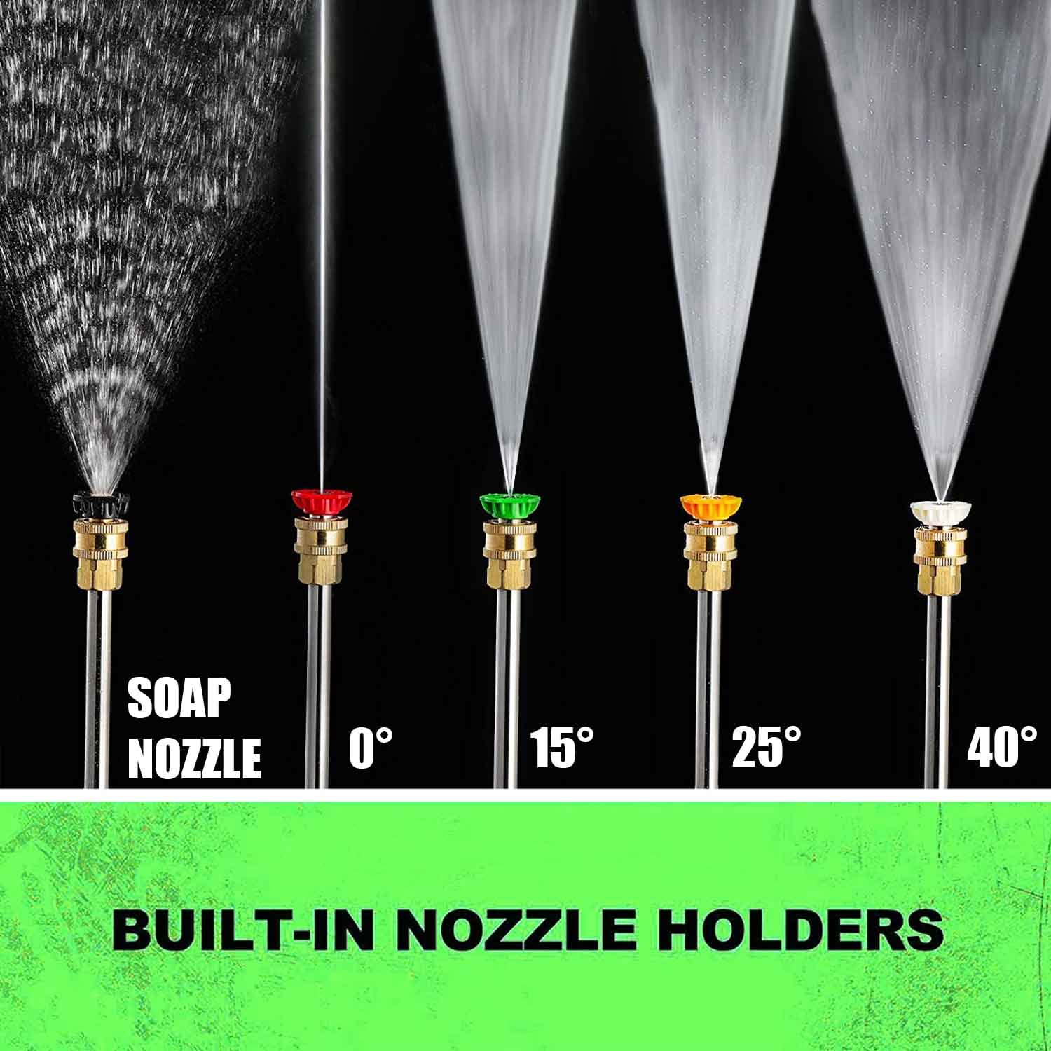 Versatile Nozzles for Every Job, Every Surface! Choose the perfect spray angle with our specialized nozzles – designed for all surfaces! The 0° tip powers through the toughest messes, 15° for concrete, 25° for wood and siding, 40° for delicate surfaces, and a black tip to get rich, soapy bubbles for car washing. Switch up and clean with precision!