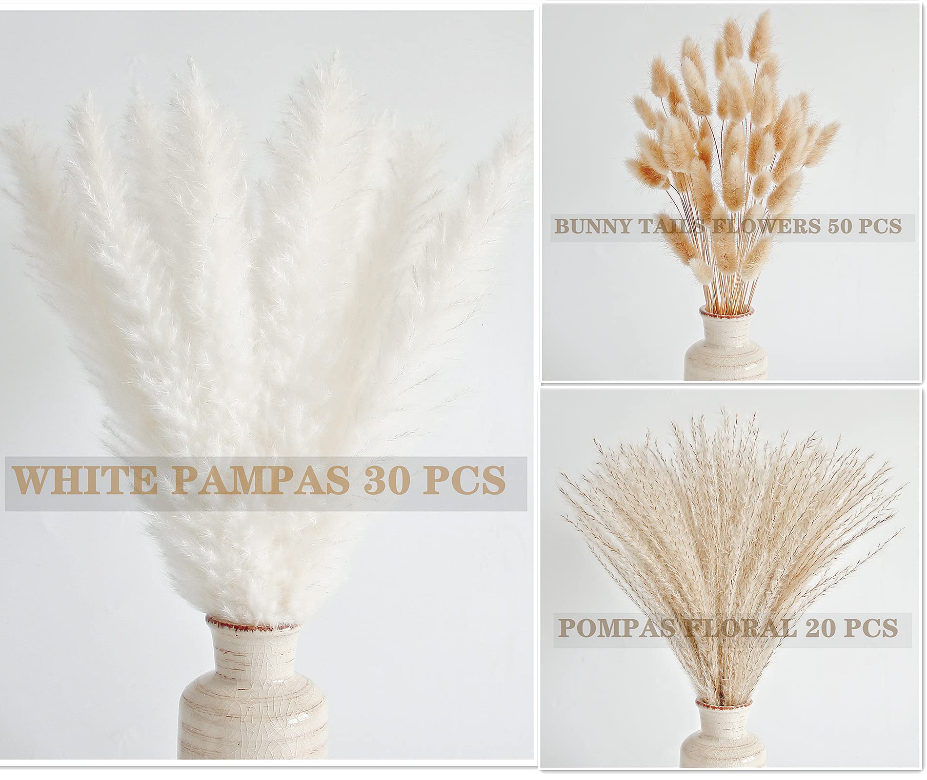 e have carefully selected a sufficient number of 100 pieces of pompuss grass, with 50 pieces of bunny tails dried flowers, 20 pieces of dried grass, 30 pieces of white pampas grass, These pampas grass decor are natural and charming in color, fluffy and smooth in feel, warm and elegant, perfect for fall pampa The decorative flowers are 14-17 inches in height and fit into small to medium-sized vases, open the package and insert it into the vase and you get an ample amount of natural driedpampas grass decor. pampas grass bouquet are very easy to care for, and after 2-3 hours of drying in the sun, the pampas decor will be fluffier, smoother, softer, and full of the scent of fall, and with no watering or maintenance, the dried bunny tailswers will not dry out and can be stored longer! Dried pampas grass have a warm color palette and fit almost anywhere, this boho flowers is suitable for boho table wedding decor centers parties living rooms bedrooms kitchens vintage country farmhouses etc This is a special gift that you can treat yourself or your family friends and colleagues with this decorative flowers. Great for birthdays, wedding anniversaries, Halloween, Thanksgiving, Christmas, etc. By the way: the composition of natural dried pampas grass decor is natural plant, there will be a small amount of pieces falling off when you just take out the grass decor will not affect the final appearance of the bouquet, after gently shaking, the dried flowers will not fall off again, keep the dried flowers away from fire and moisture, they can be stored for a longer time. Thank you for your order, if you have any ideas please post your comments and we will provide you with friendly service