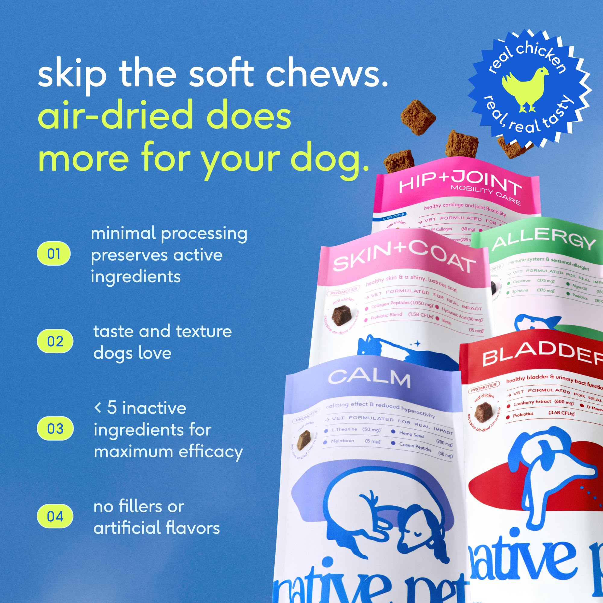 TASTY CHEWS DOGS LOVE: These dog supplements for joint and arthritis double as a delicious chicken treat, making pain relief for dogs simple and stress-free. A tasty dog pain reliever that supports joint health without the struggle of pills or powders.