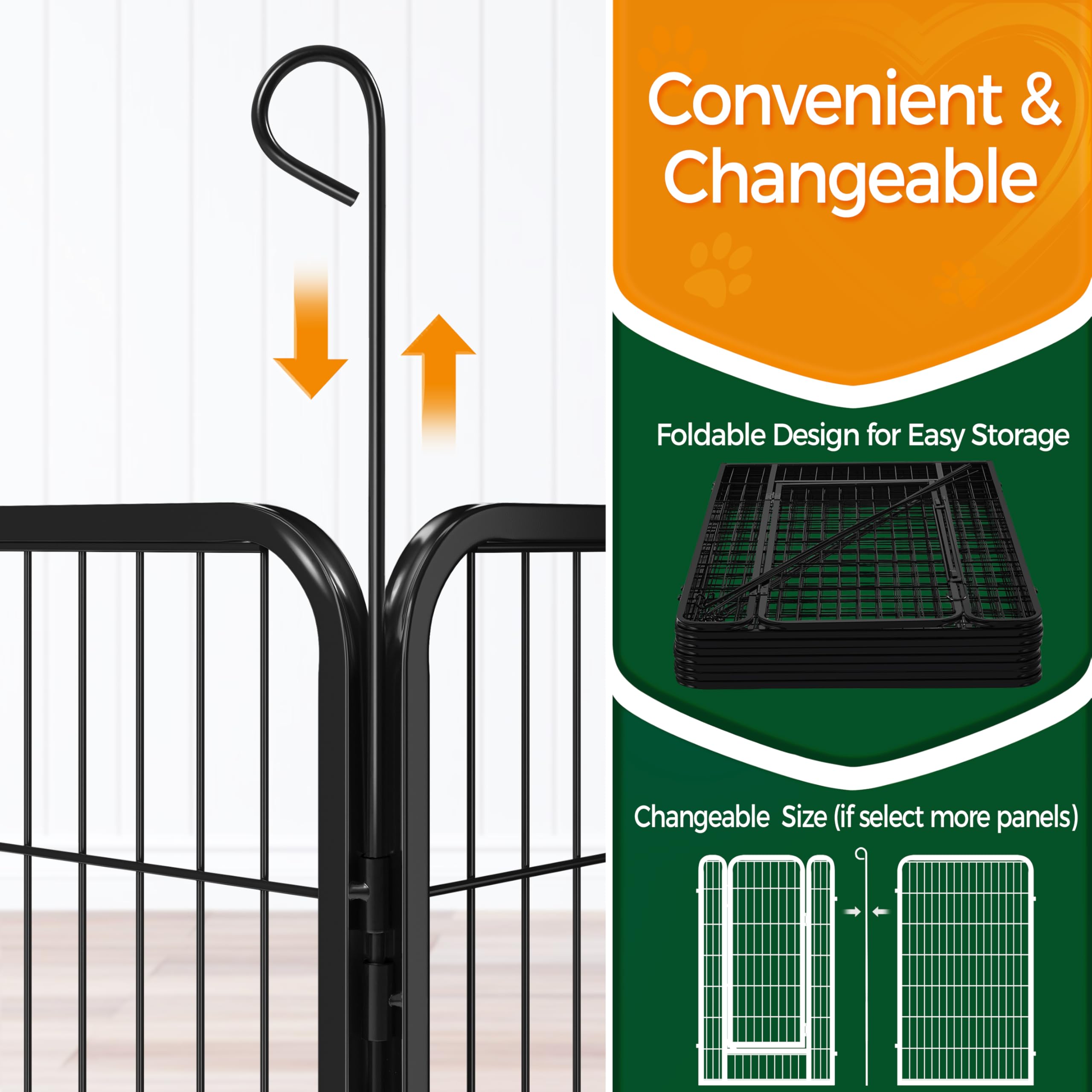 Expandable Playpen System: Each panel measures 28" W 47.5" H. Eight pet playpens can be connected to a larger enclosure space that allows your pets to rest and play without worrying about them running off. You can buy more sets to increase the size of the playpen