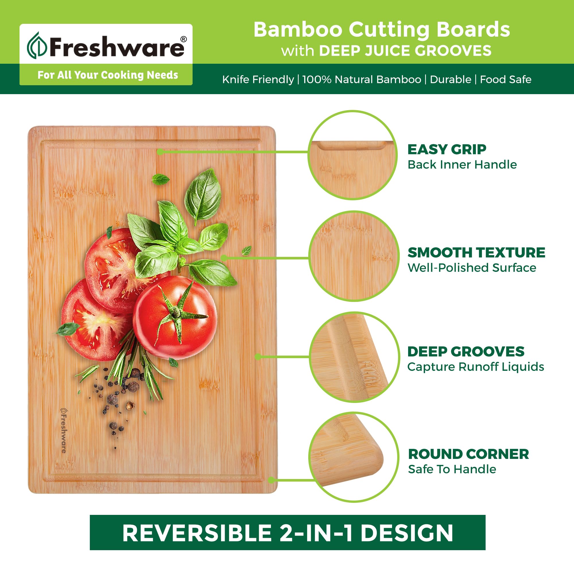 STAY FIT and HEALTHY - Chop, Slice or Dice your Delicious Homemade Food With The #1 Bamboo Cutting Boards (Set of 3) By Freshware! Enjoy Freshware professional quality cutting board set. Ideal to meet all your meal prep needs for cutting fruits, vegetables, meat and bread. Plus, they wonβt dull your favorite kitchen knives. Made from 100% food-grade organic moso bamboo, these cutting boards will be your best buddy in kitchen. Our elegant 2-in-1 reversible design with smooth, rounded edges and handles can be used as a serving tray or trivet mat for hot dishes. This cutting board set is a perfect gift to friends or families for birthday party, housewarming event, wedding ceremony or holiday seasons. Our chopping board is extremely sturdy yet lightweight and can be carried everywhere you go. At a picnic in the woods, a beach excursion or lake camping! Use hot water and soap to wash, then let the cutting board air dry. Occasionally use mineral oil to extend the life of the cutting boards. Bamboo is easier to wash than a wood cutting board and safer than plastic. Hand wash only. Do not use in dishwasher. Packages Includes: β 1 x Small Cutting Board: 9 x 6 x 0.6 inch or 22.9 x 15.2 x 1.5 cm. β 1 x Medium Cutting Board: 12 x 8 x 0.6 inch or 30.5 x 20.3 x 1.5 cm. β 1 x Large Cutting Board: 15 x 10 x 0.6 inch or 38.1 x 25.4 x 1.5 cm. β Material: 100% Food-Grade Organic Moso Bamboo. Freshware is full of passion and craftsmanship that we have devoted ourselves to bringing you the finest cutting board to meet all your chopping needs at a value without compromising quality.