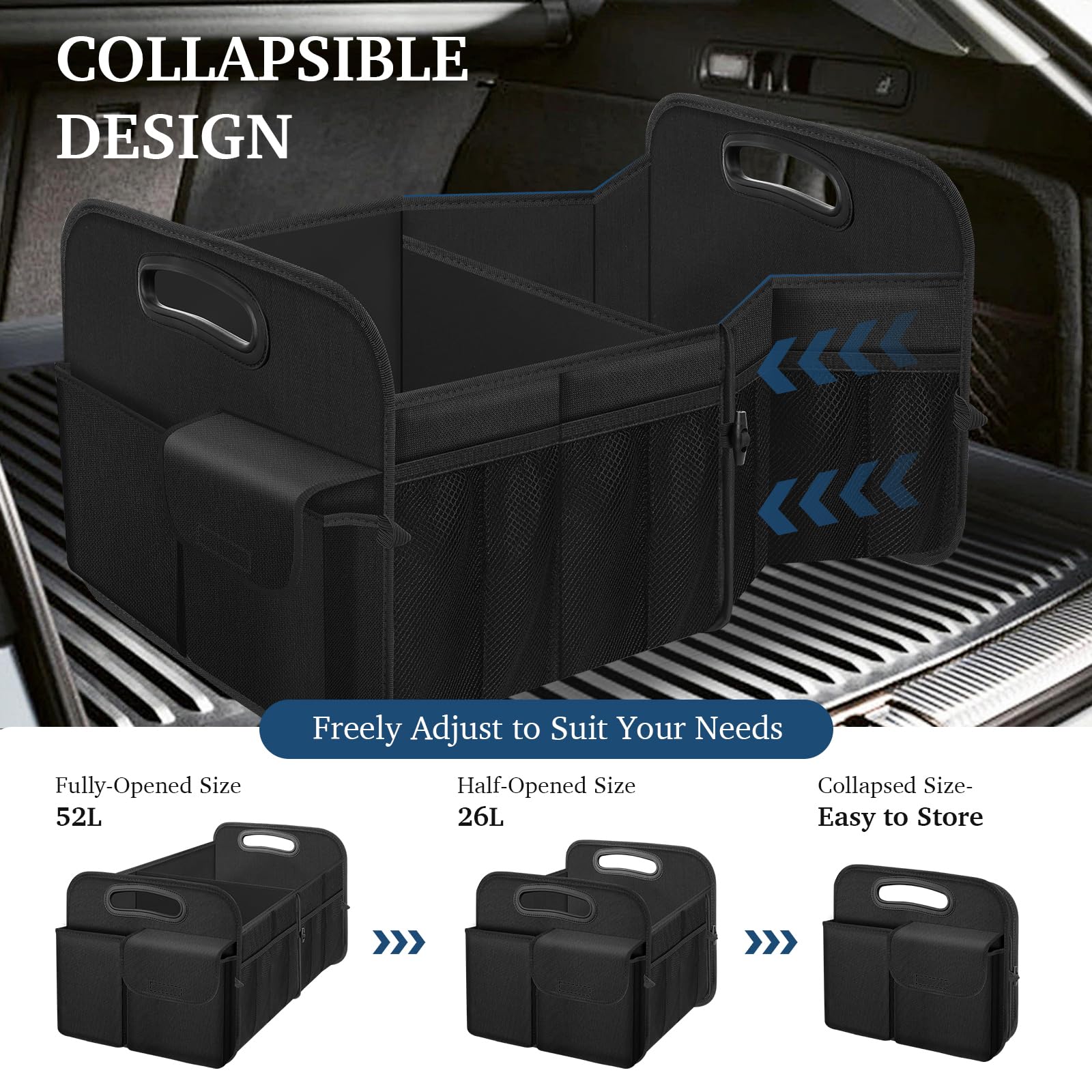 【Collapsible Trunk Storage】:The trunk organizer for suv collapsible multi compartments with removable divider can fold the size that you need in your car interior and fold away when not in use. Foldable and portable.