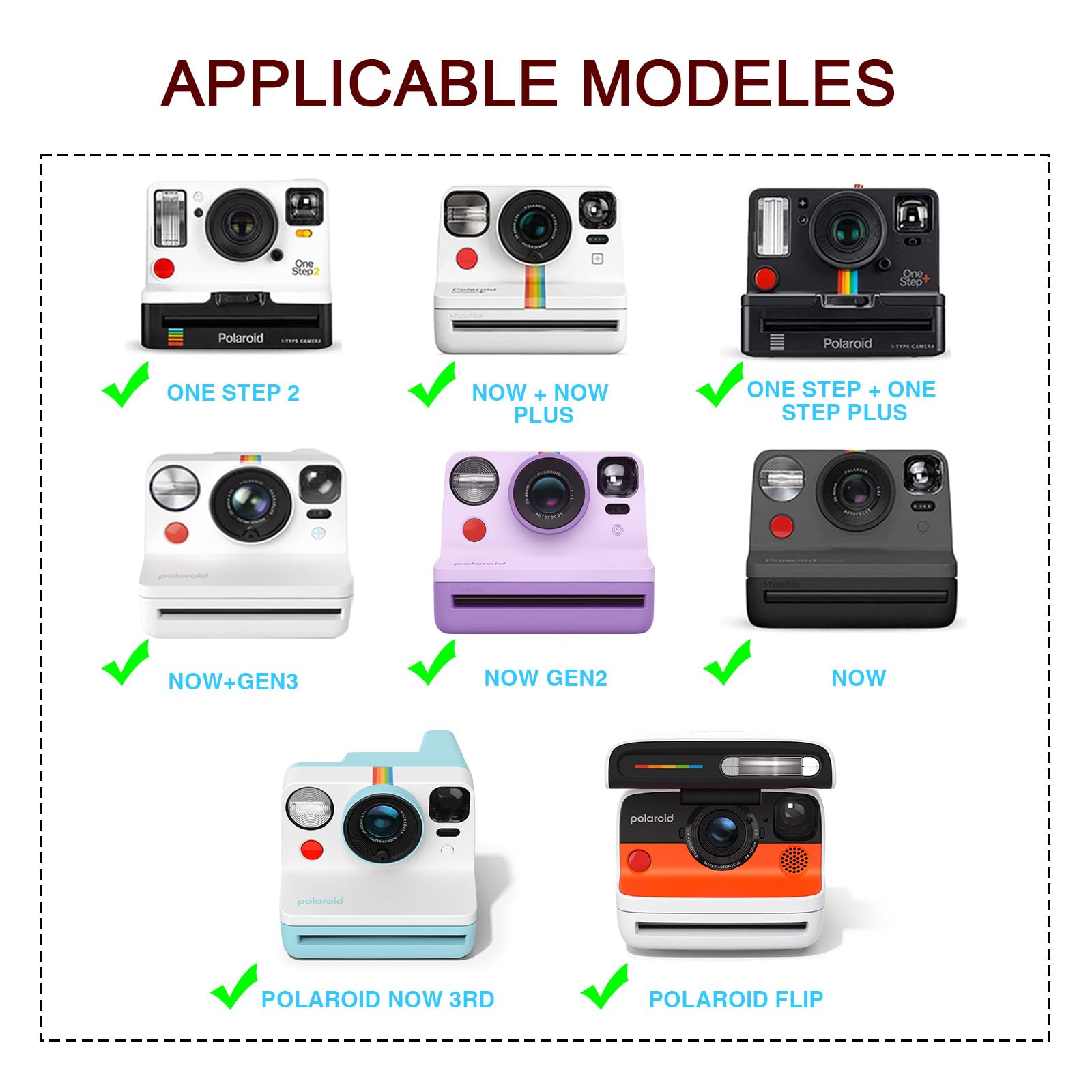 Camera case is only suitable for polaroid onestep/now/now+ series instant film cameras, compatible with polaroid onestep+, onestep2, now, now+ instant film cameras, camera case dimensions are: 7 x 5.5 x 4 inches (Note: No camera)