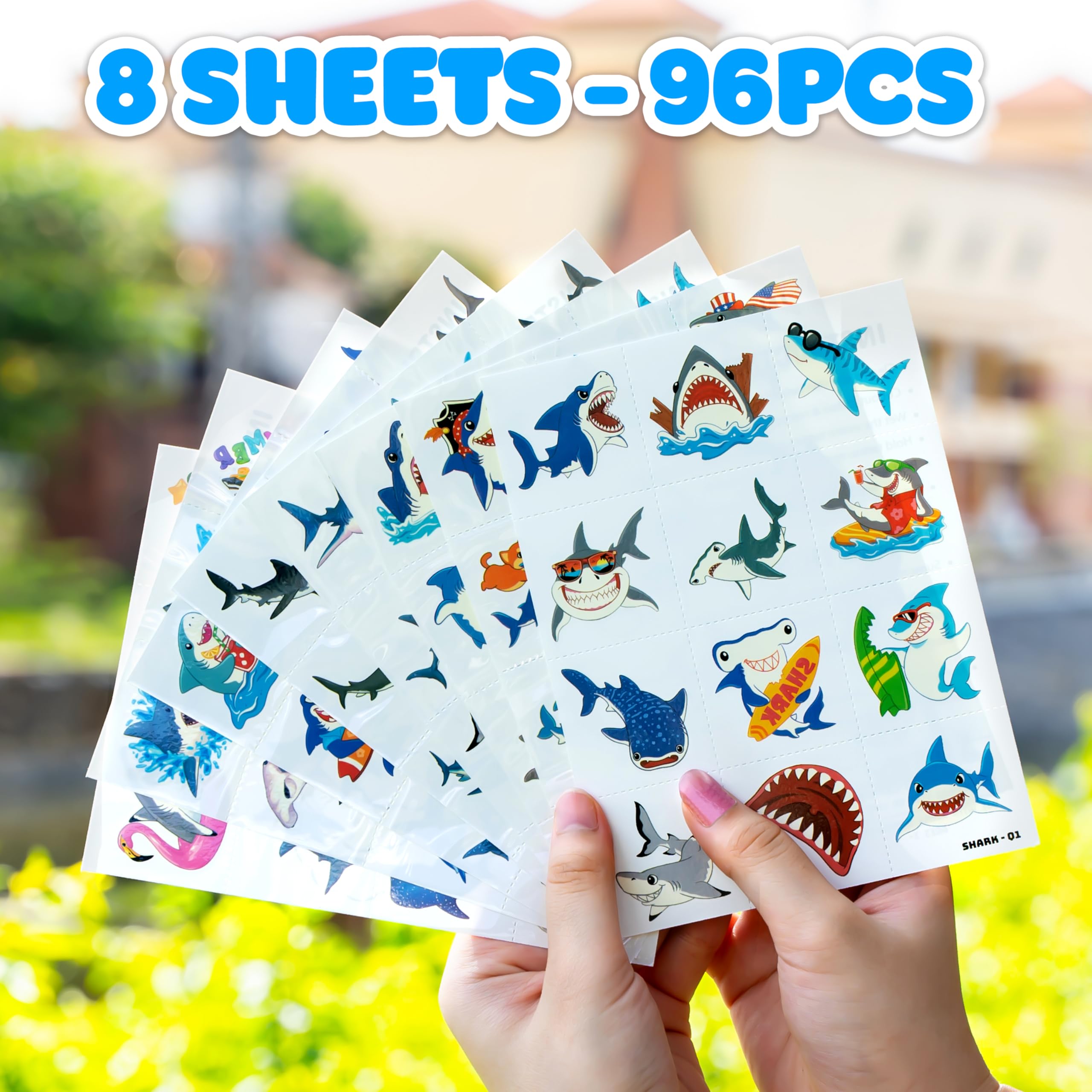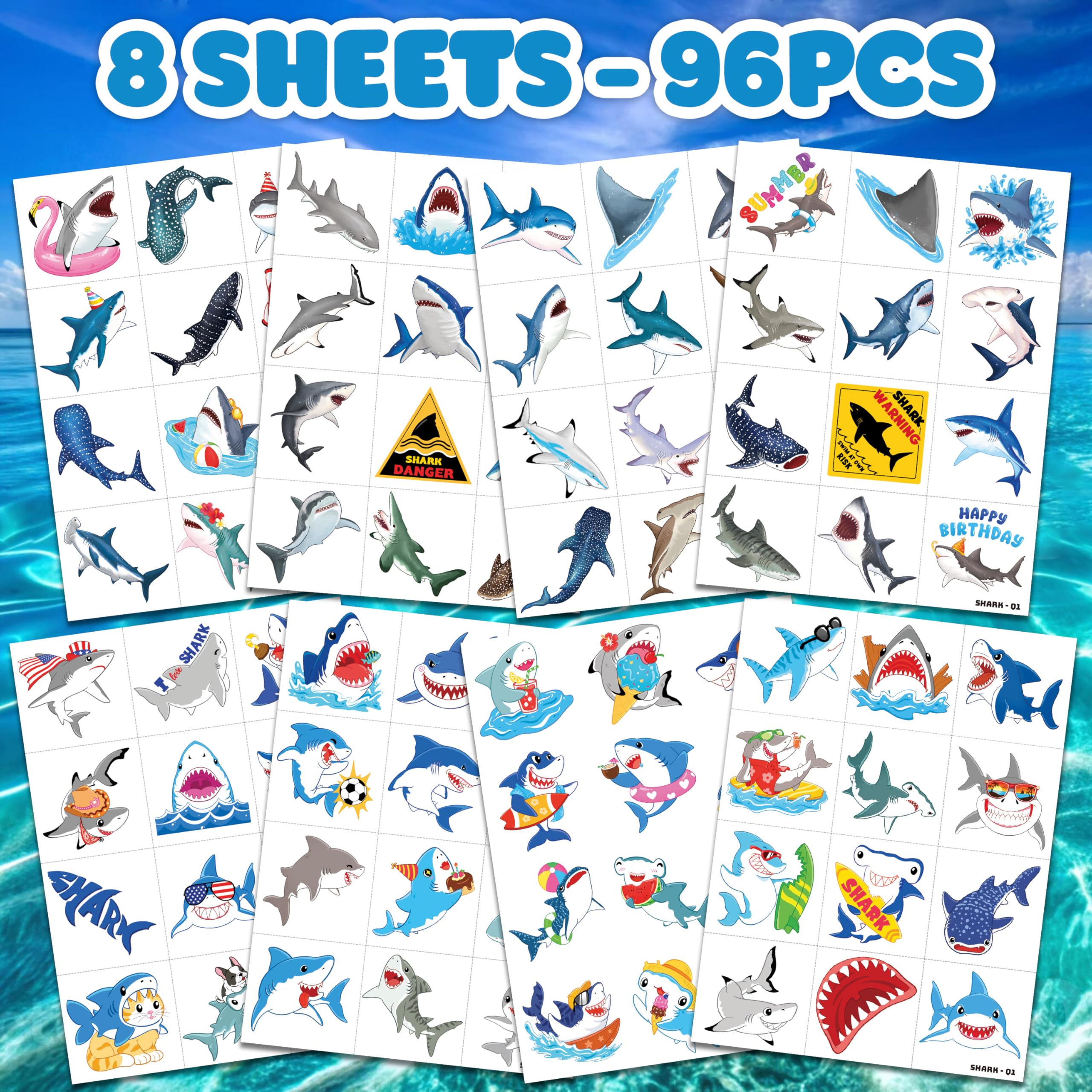 Package Includes: 8 Sheets Shark Ocean Animal Pre-Cut temporary tattoo, total 96 PCS different designs tattoos stickers. The sheets measures 6.3 inch X 4.7 inch, one size fit all adult and kids. Can meet most of your needs.