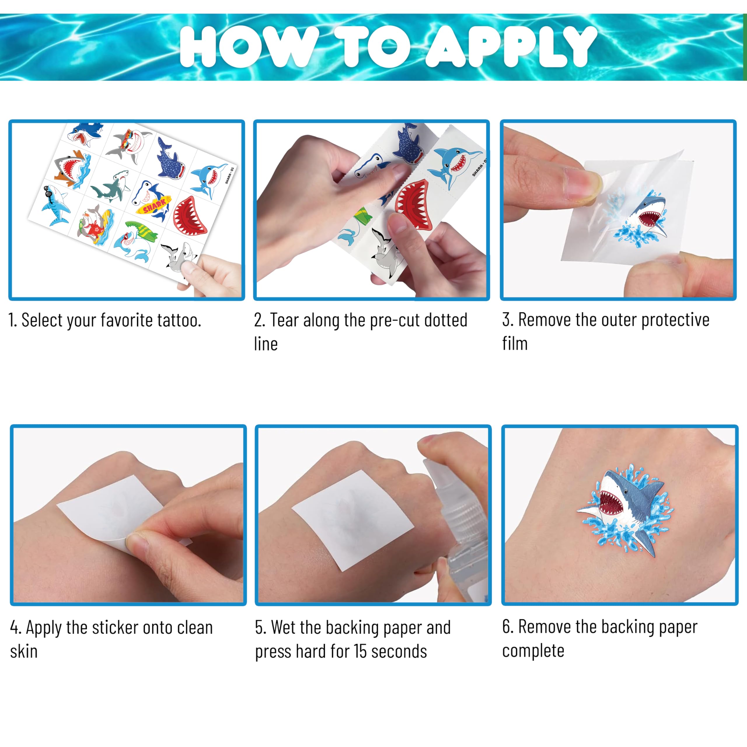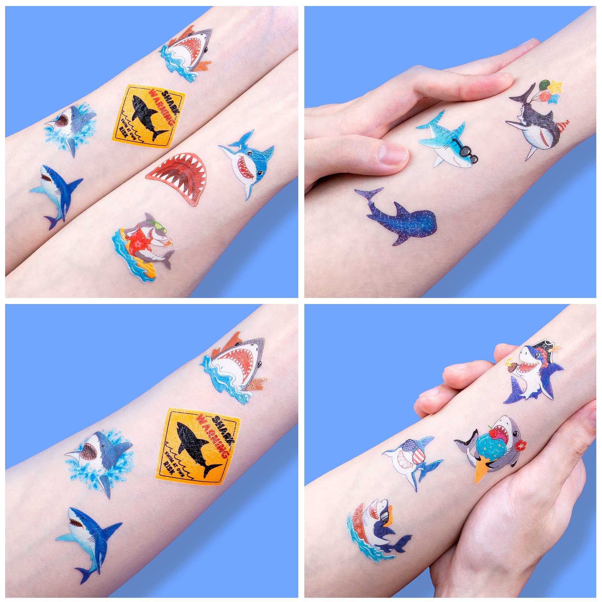 Perfect for Shark Ocean Animal Birthday Party Decorations Supplies & Events: Great for themed party, birthday activities, school reward and other party events. This tattoos stickers can be applied on arms, hands, face, neck, shoulders,... to make you look cool at all kinds of party. Popular hit with your kids. You can apply them to your body or some smooth objects, for example, glass, laptop, paper, cups, bottle,..