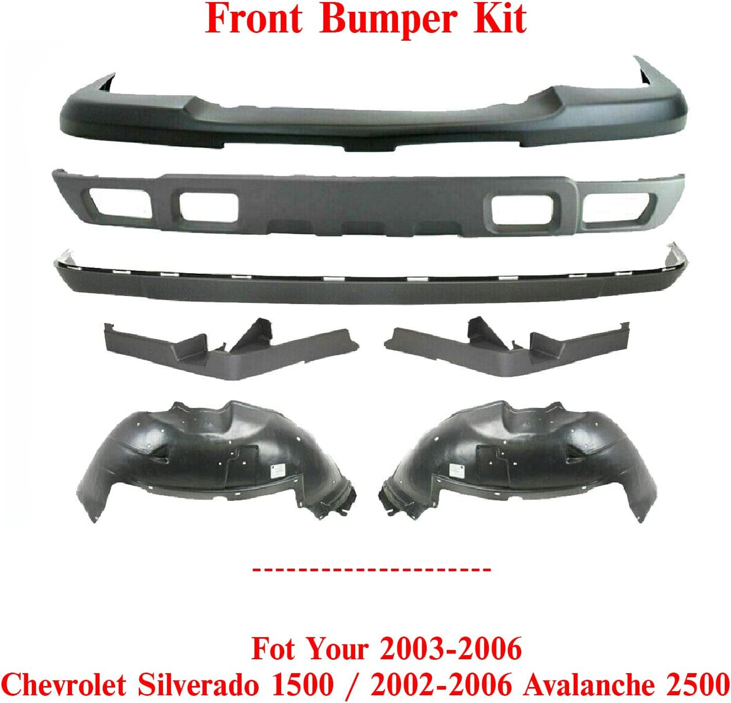 NEW FRONT BUMPER UPPER COVER + LOWER VALANCE + EXTENSION + FILLERS + FENDER LINERS FOR 20032006 CHEVROLET SILVERADO 1500 / 20052006 AVALANCHE 2500 DIRECT REPLACEMENT 15095669 15186612 GM1247110 GM1246110 GM1051110 GM1092204 GM1092200 GM1089169 GM1088169 If you are not sure this item will fit your vehicle, please email us your car photo or provide your vehicle's YEAR, MAKE, MODEL and ENGINE SIZE before you purchase this item. Brand New in the Box Fit and Quality ! Includes 7 Parts: 1x Front Bumper Upper Cover Textured 1x Front Lower Valance Air Deflector with Fog Light Holes 1x Front Lower Valance Extension Textured 1x Front Filler Left Driver Side 1x Front Filler Right Passenger Side 1x Front Fender Liner Left Drive Side 1x Front Fender Liner Right Passenger Side Specification: Only For Light Duty / Not For HD Models / Also Fit with 2007 Classic Model Condition: New OEM Number: 15095669 15186612 15139805 10397999 10386198 15102065 15188701 Parts Link Number: GM1247110 GM1246110 GM1051110 GM1092204 GM1092200 GM1089169 GM1088169 Fits: Chevrolet For 2002 Avalanche 1500 For 2003 Avalanche 1500 For 2004 Avalanche 1500 For 2005 Avalanche 1500 For 2006 Avalanche 1500 For 2002 Avalanche 2500 For 2003 Avalanche 2500 For 2004 Avalanche 2500 For 2005 Avalanche 2500 For 2006 Avalanche 2500 For 2003 Chevrolet Silverado 1500 LS For 2003 Silverado 2500 Base For 2004 Silverado 2500 Base For 20032004 Chevrolet Silverado 2500 LS For 20032005 Chevrolet Silverado 1500 Base For 20032006 Chevrolet Silverado 1500 LS For 20042006 Chevrolet Silverado 1500 Hybrid For 2005 Chevrolet Silverado 1500 Base For 2005 Chevrolet Silverado 1500 LS For 2007 Chevrolet Silverado 1500 Classic Hybrid For 2007 Chevrolet Silverado 1500 Classic LS