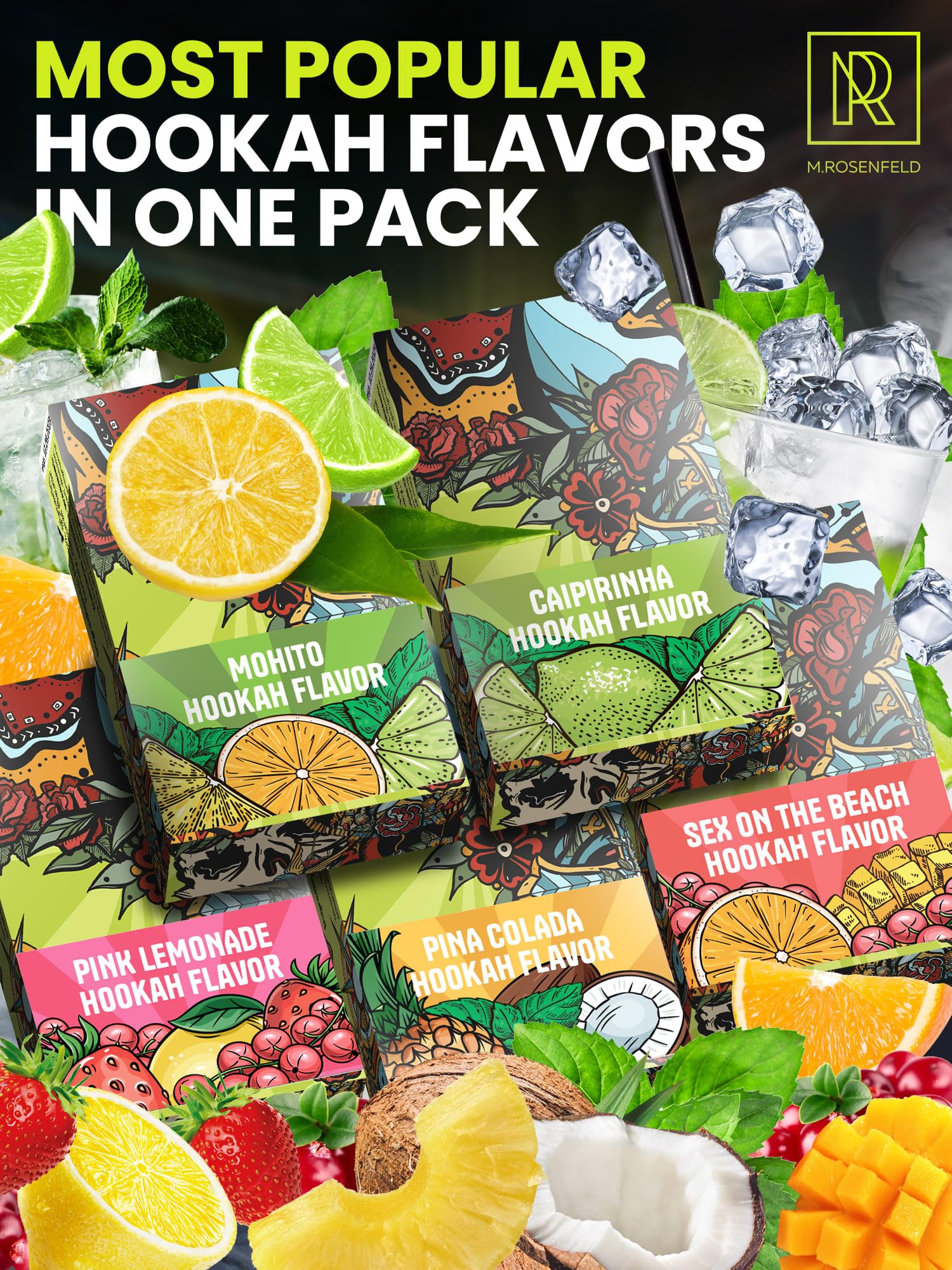 MOST POPULAR & JUICY HOOKAH FLAVORS IN ONE PACK - Tasty and realistic hookah tobacco flavor aromas of Pina Colada, Mojito, Sex on the Beach, Caipirinha, and Pink Lemonade in 50g pouches. Herbal shisha flavors. Shisha molasses hookah flavors for up to 10 hookah bowls.