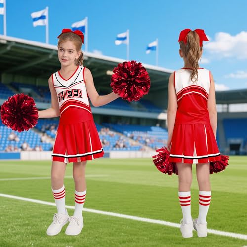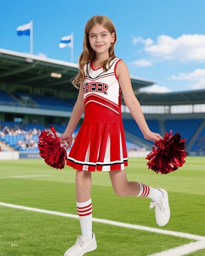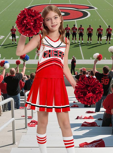 Classic Cheerleader Design – Bold & Energetic! Full cheerleader costume for girls set includes: Sleeveless top + pleated skirt + pom poms (pair) + cheer socks, FREE 1 distressed hair bow – ready to wear, no extra purchases needed! Flattering fit with a cropped top and high-energy pleated skirt, perfect for game day, pep rallies, or spirit events