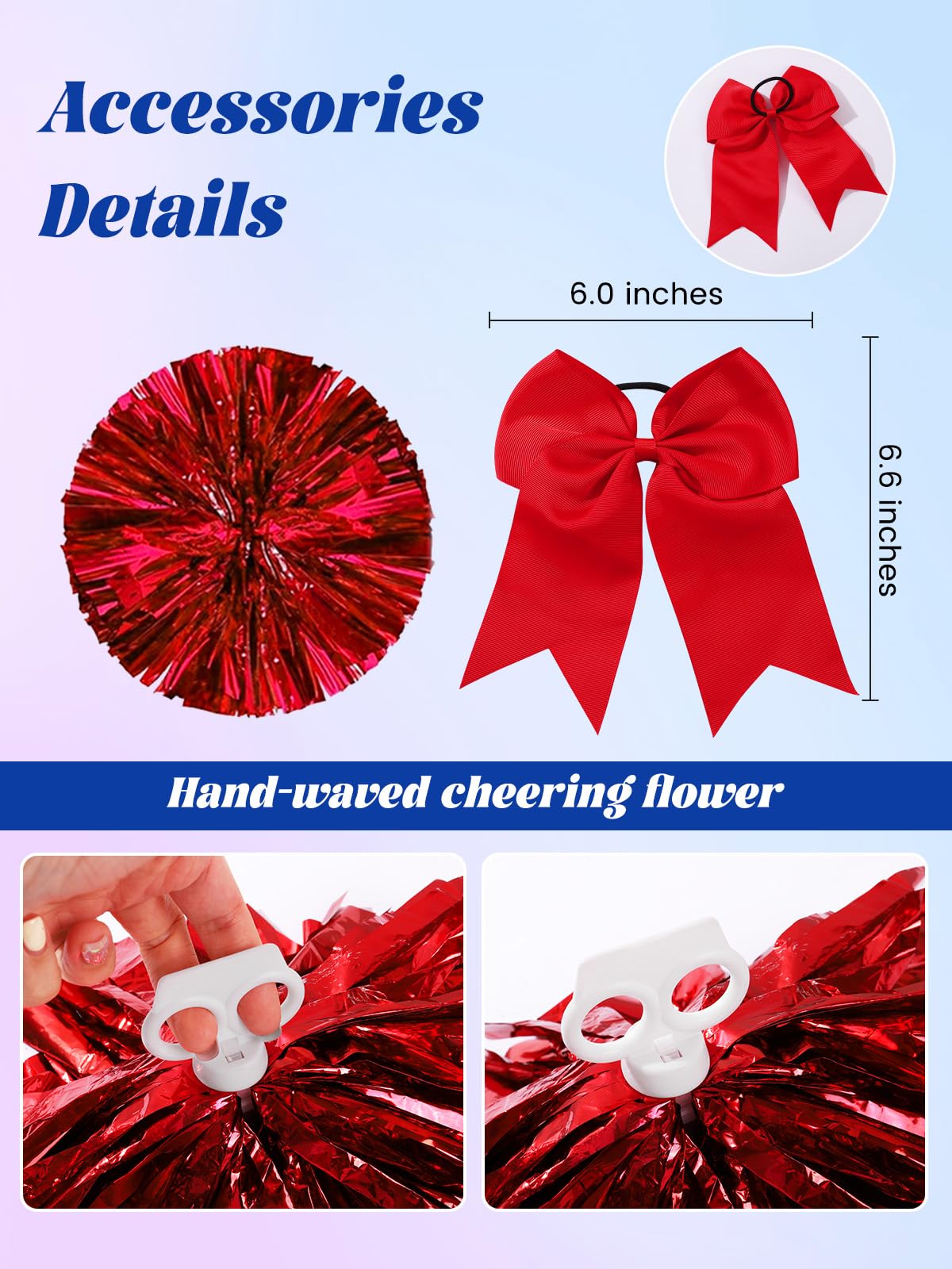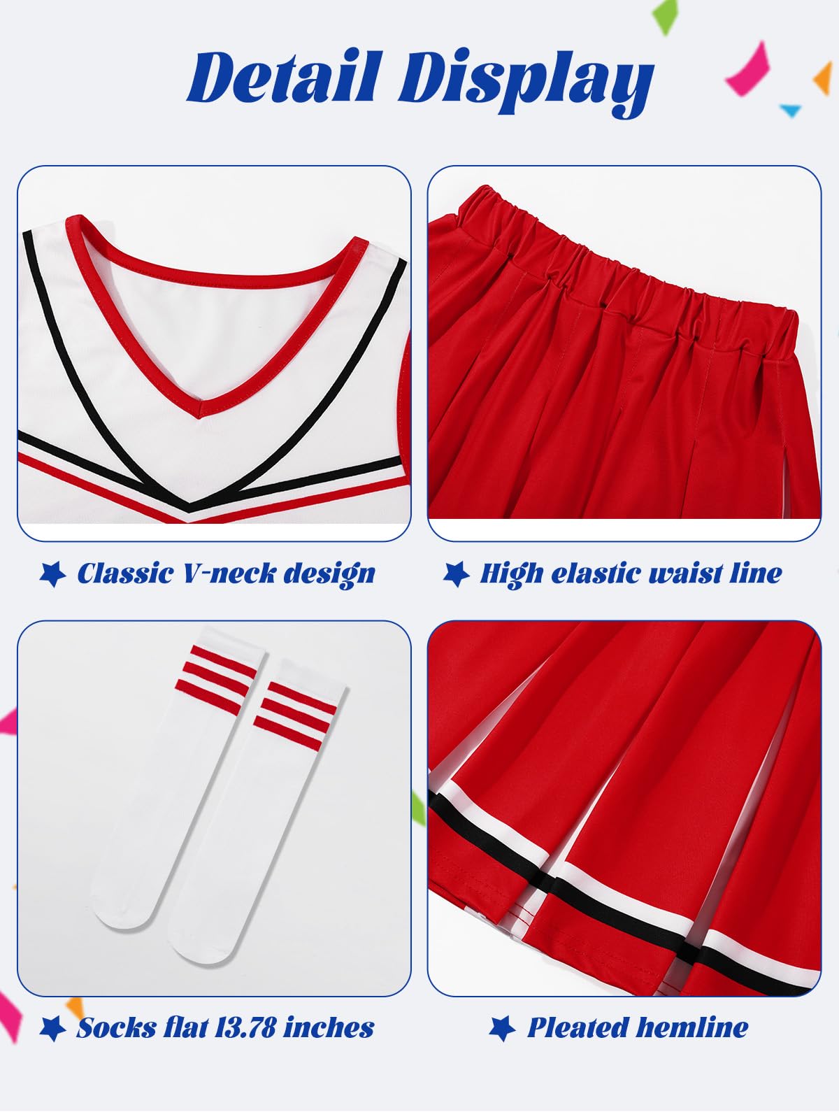 Game-Ready Accessories – Attention to Detail! Cheer leader costumes for girls adjustable hair bow stays secure during routines. Lightweight cheer pom poms (perfect for cheerleading, parades, or photo ops!) Elasticized socks with extra cushioning for all-day comfort