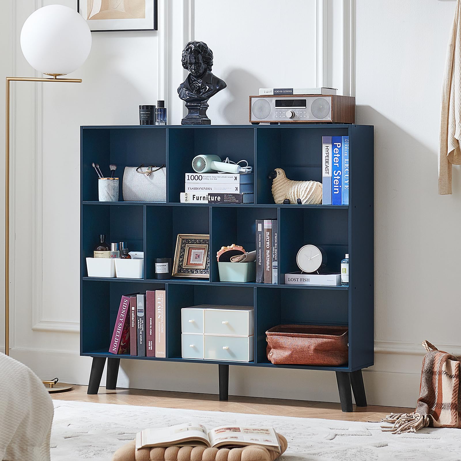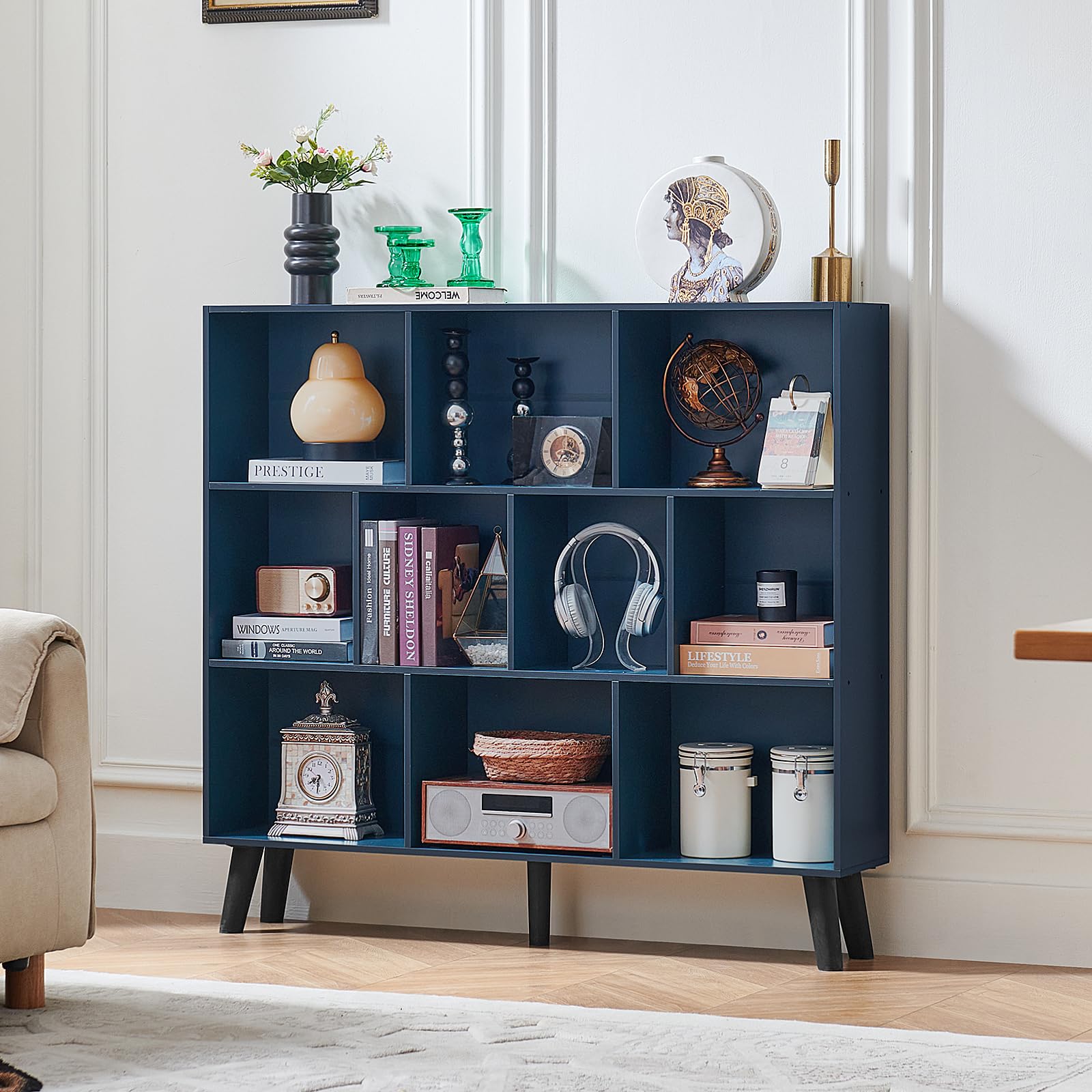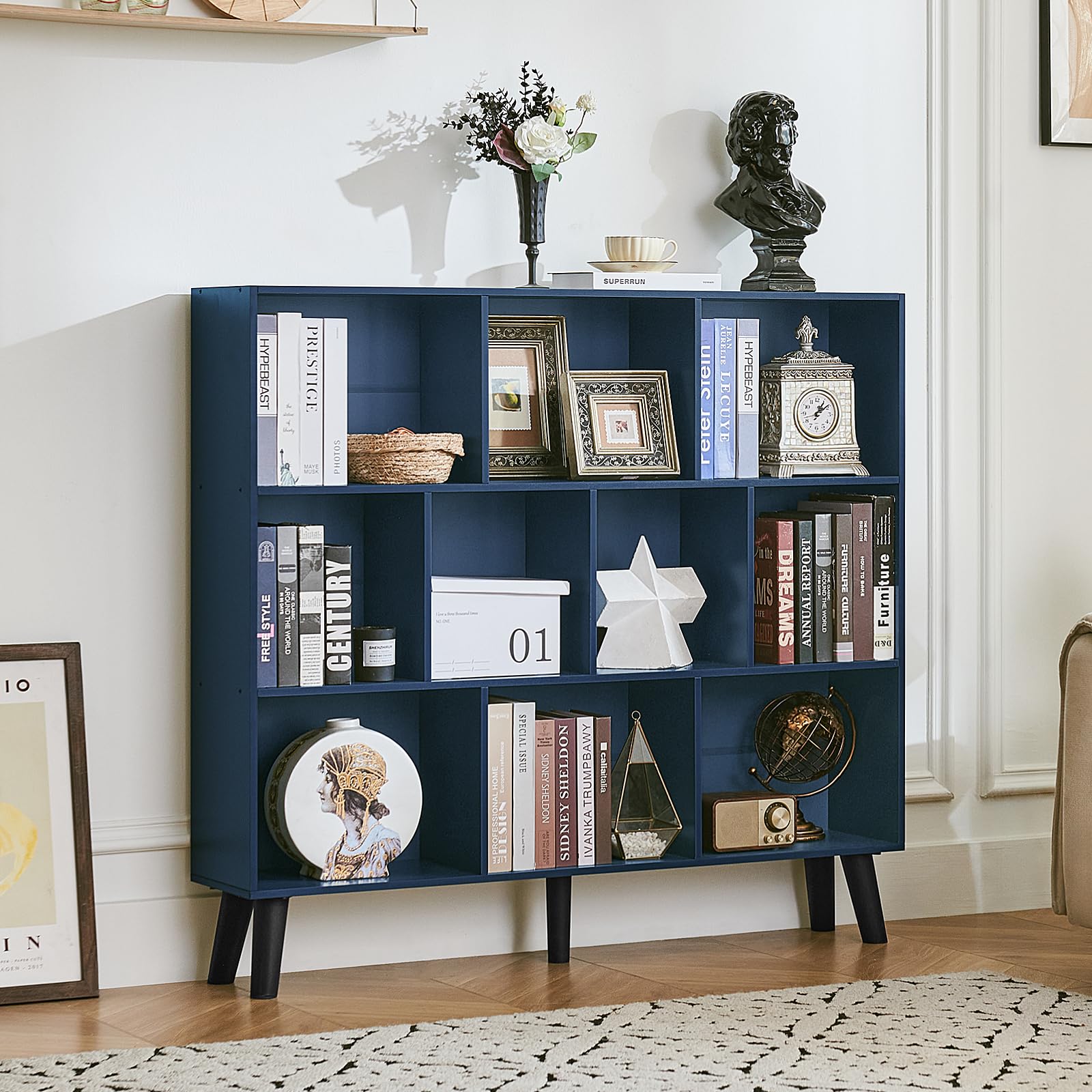 LEYAOYAO 10 Cube Bookshelf,3 Tier Modern Wide Bookcase with Legs,Mid-Century Wood Bookshelves Storage,Dark Blue Large Book Case,Freestanding Organizer Display Shelf for Bedroom,Living Room,Office