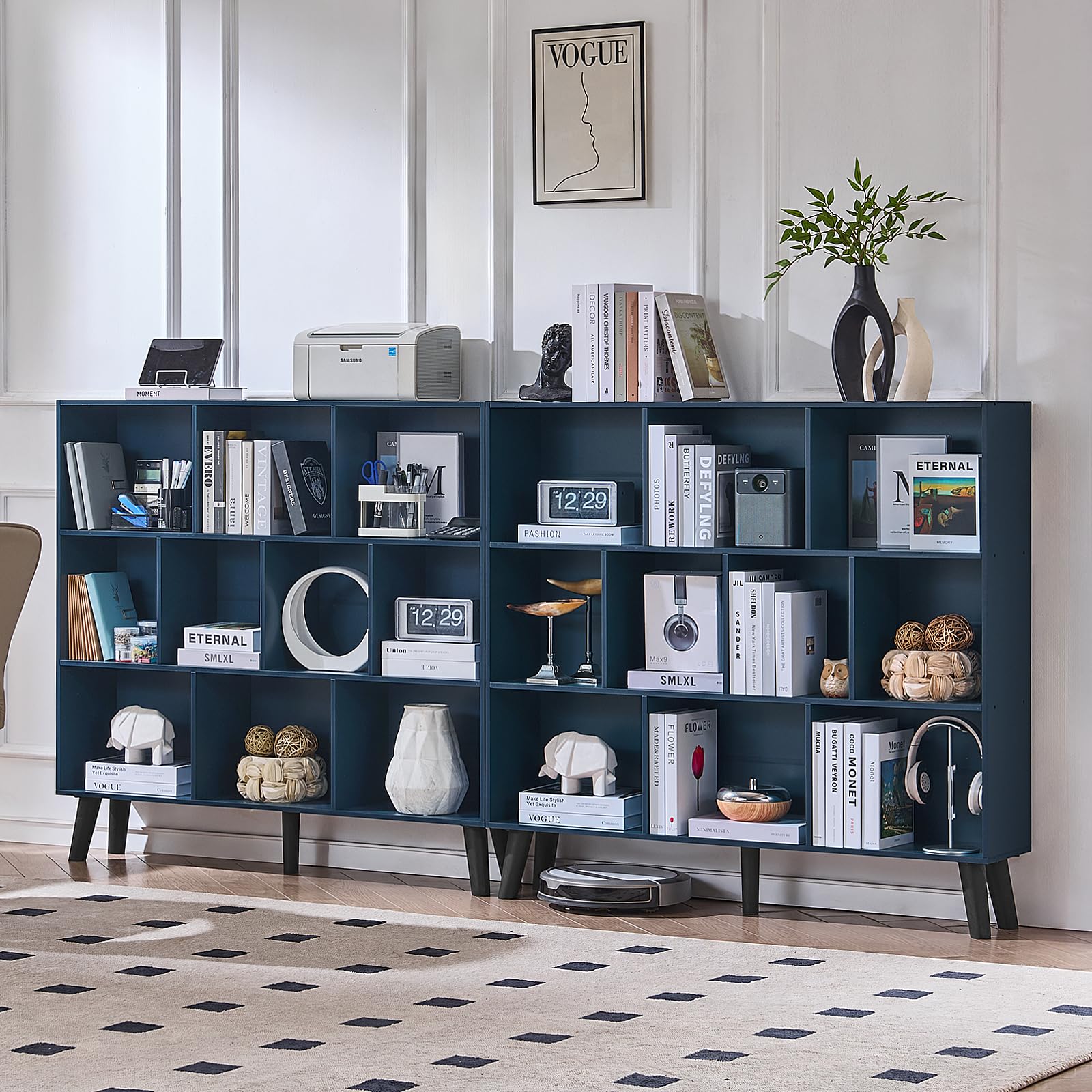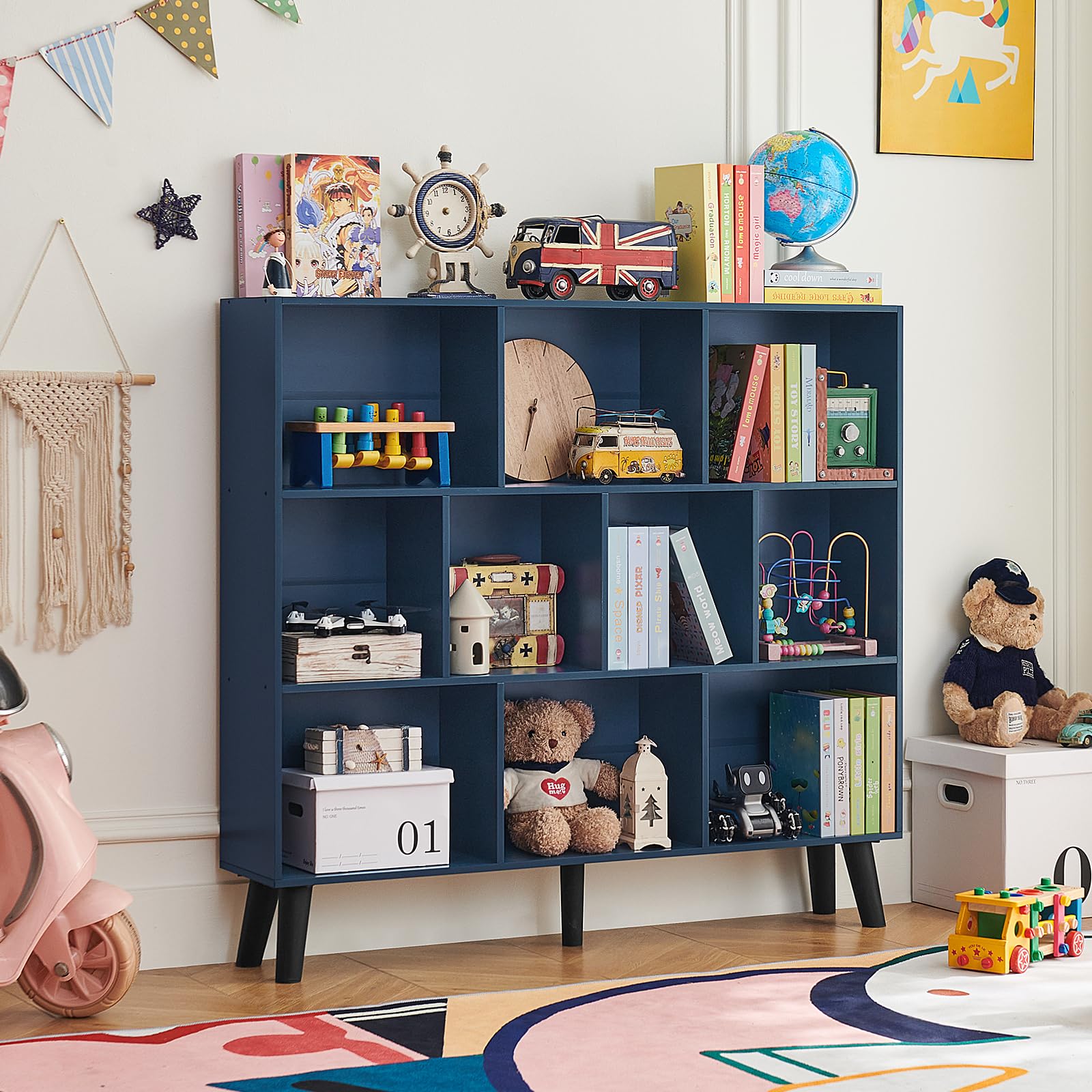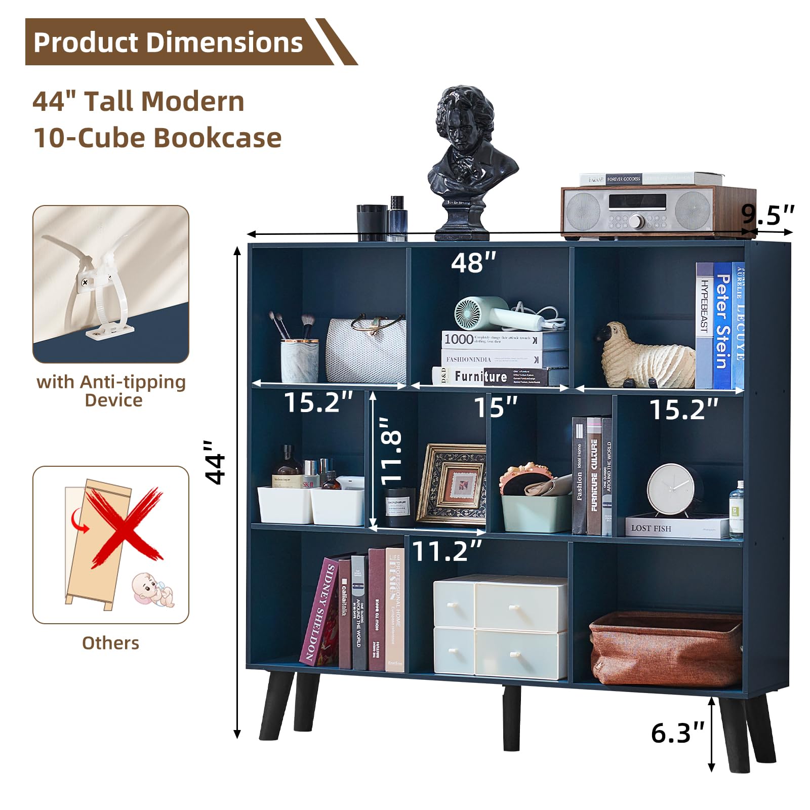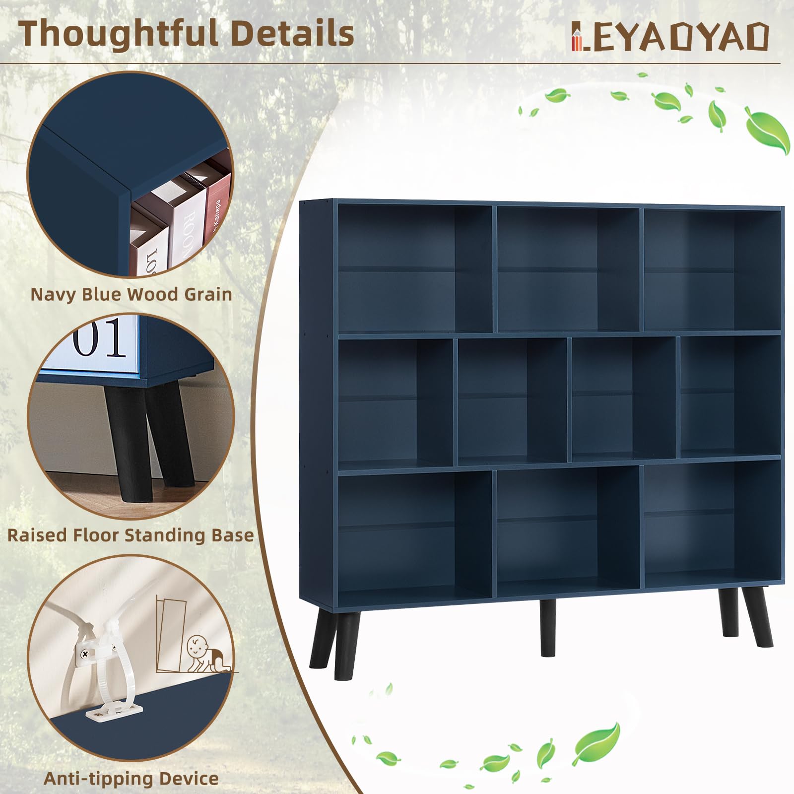 LEYAOYAO 10 Cube Bookshelf,3 Tier Modern Wide Bookcase with Legs,Mid-Century Wood Bookshelves Storage,Dark Blue Large Book Case,Freestanding Organizer Display Shelf for Bedroom,Living Room,Office