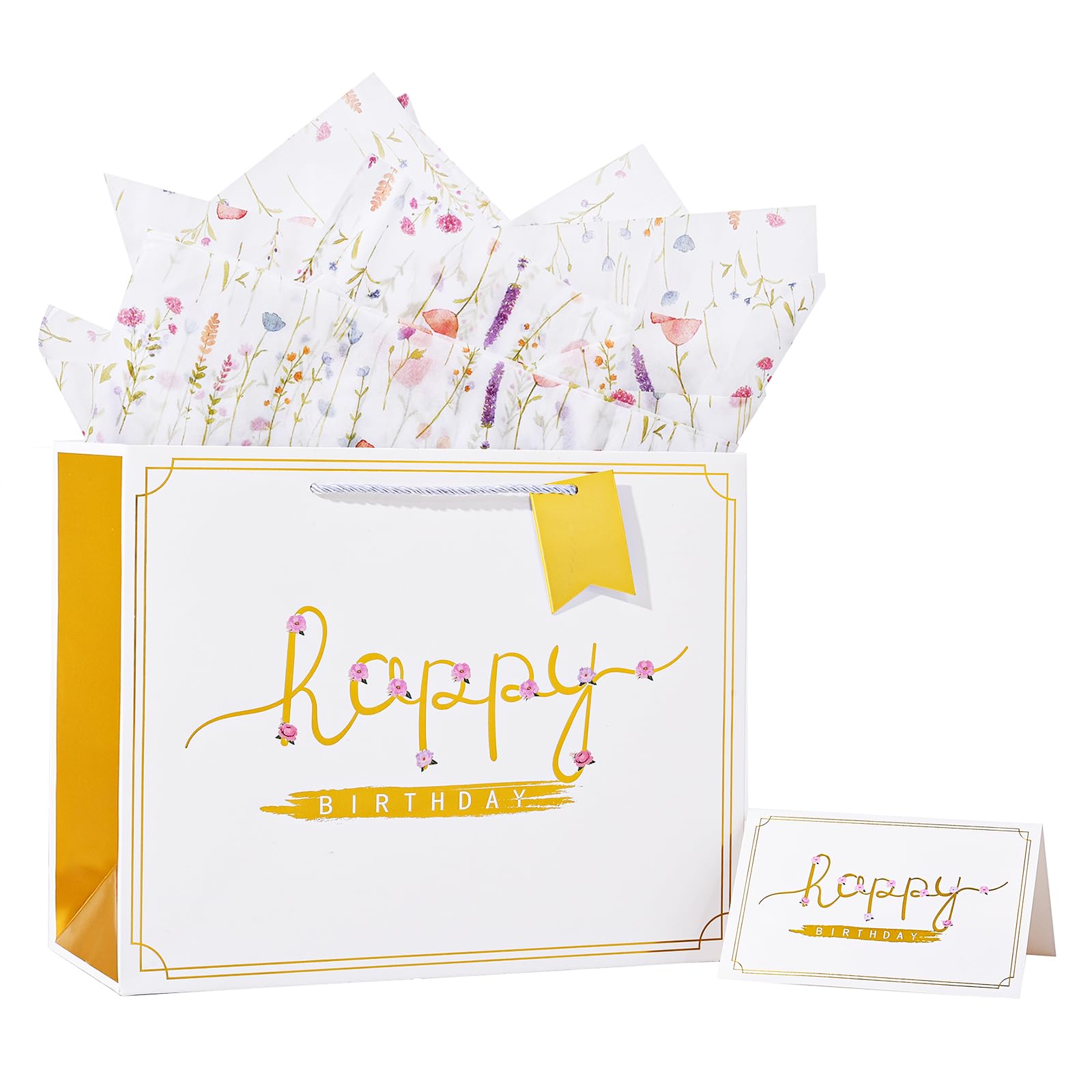 【Gift Bag and Tissue Paper】The gift bag set includes matching tissue paper, matching greeting card and tags. Ribbon handles add sophistication to the gift wrap.