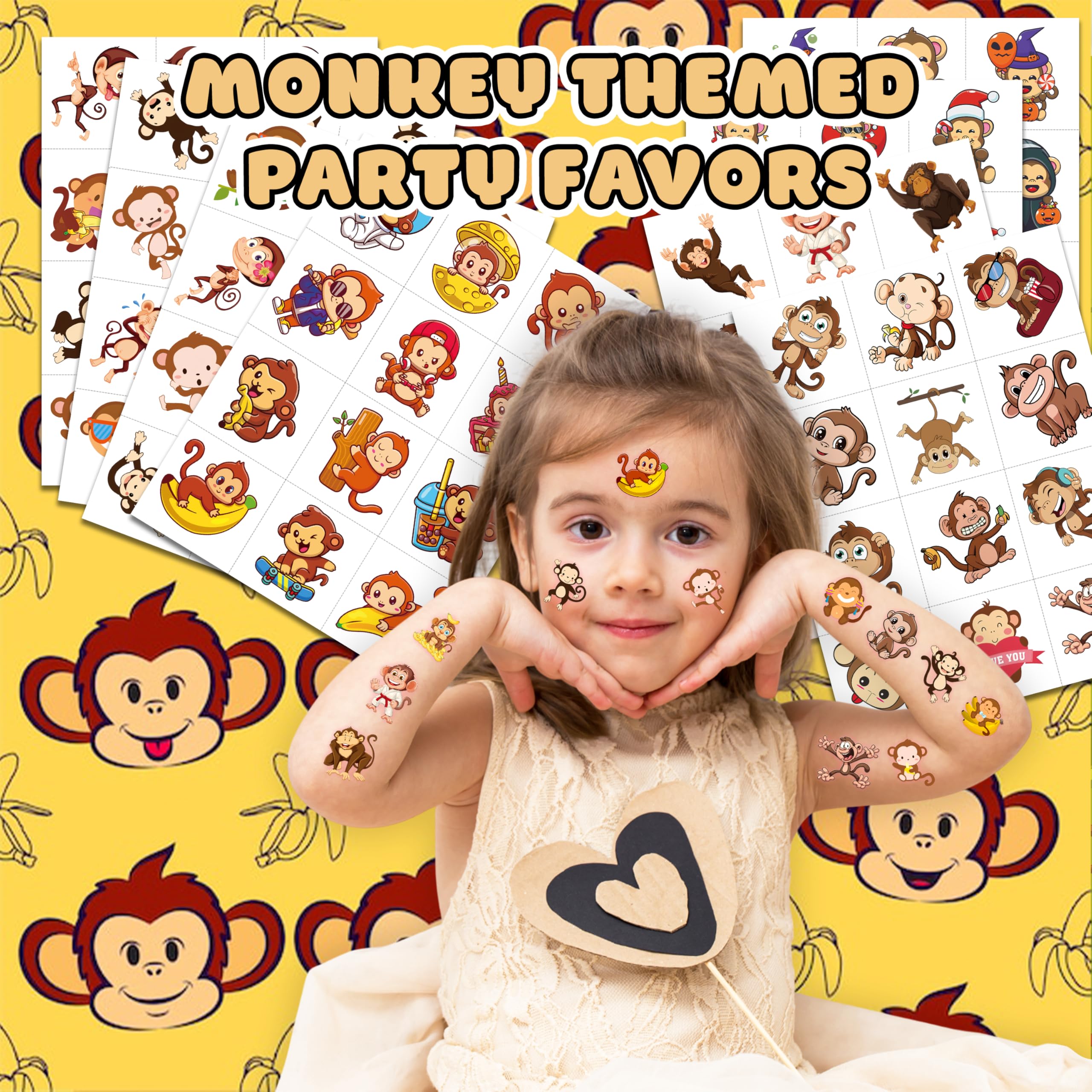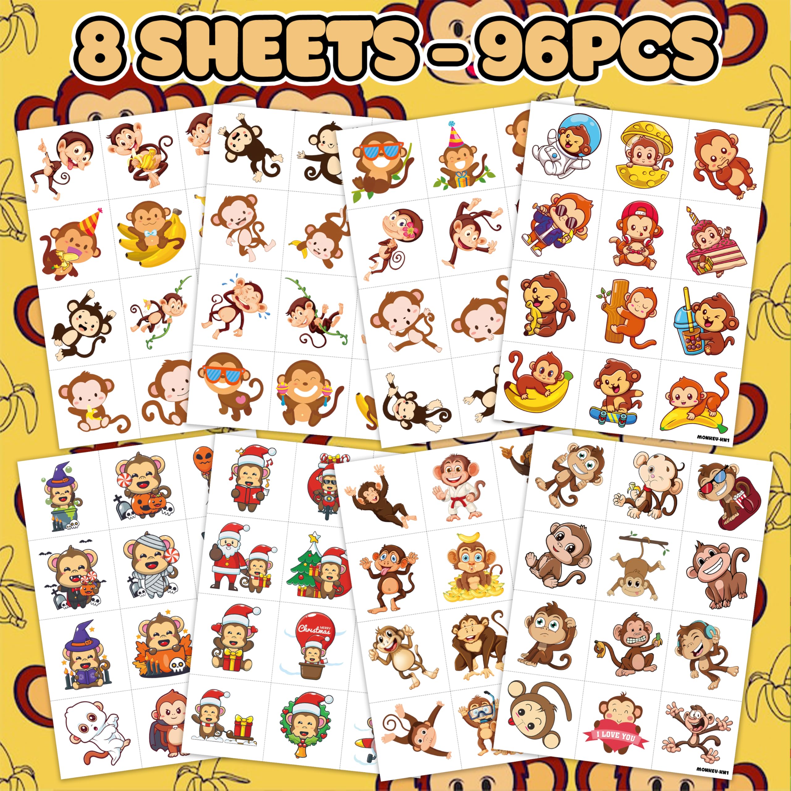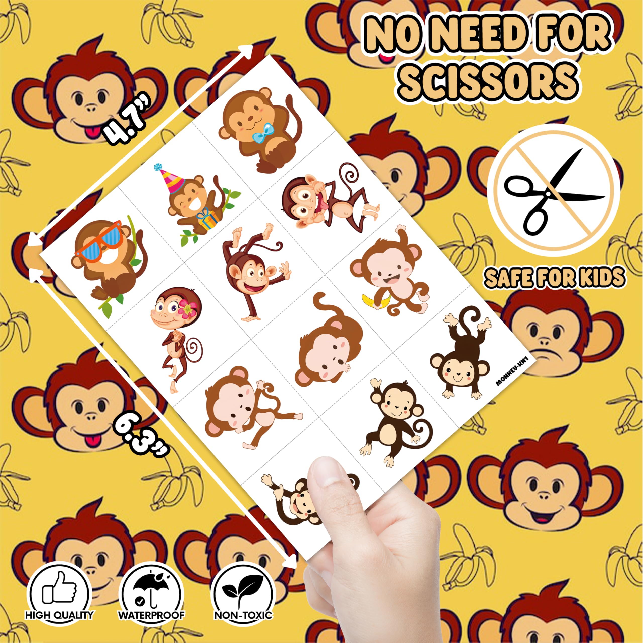 🐵 96 Fun Jungle Tattoos – Includes 96 adorable monkey temporary tattoos across 6 large sheets (6.3 x 4.7 inches each), featuring playful monkeys swinging, dancing, and smiling in colorful jungle scenes.