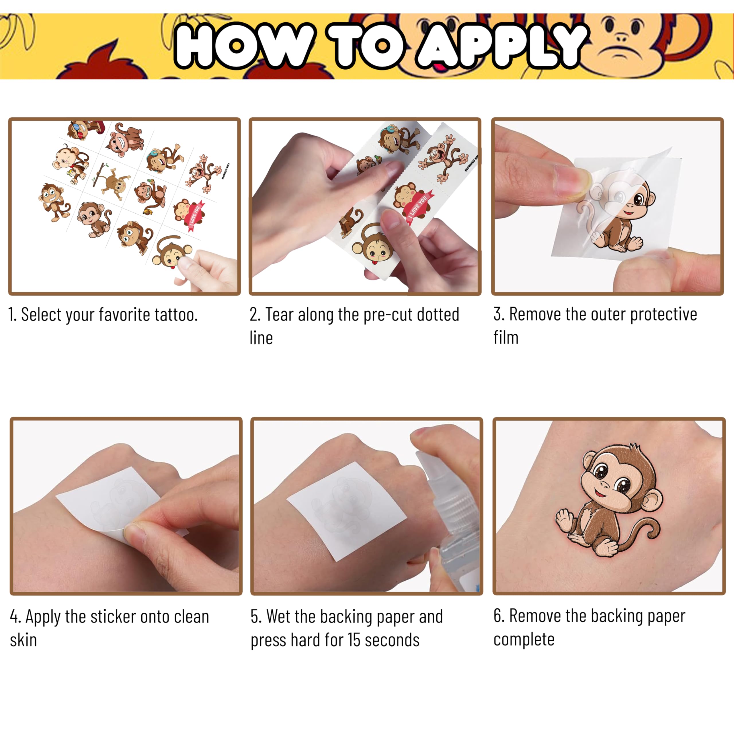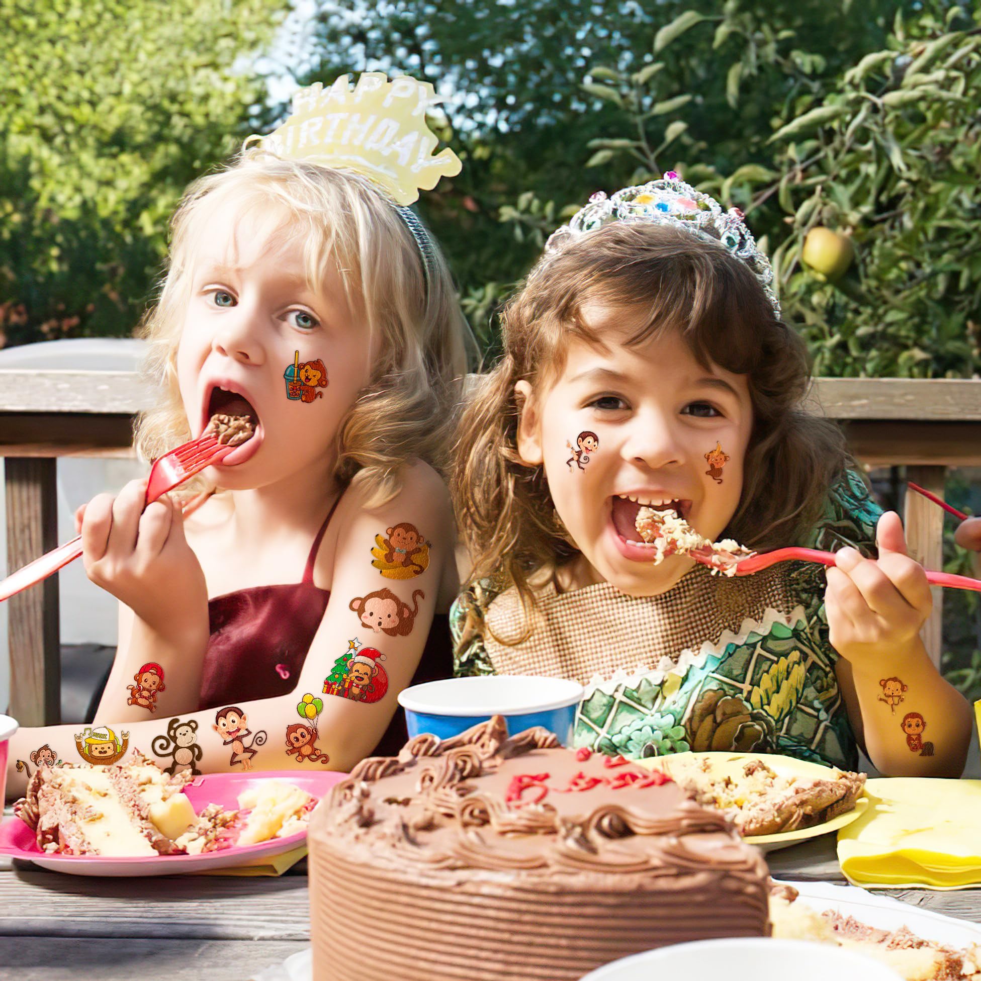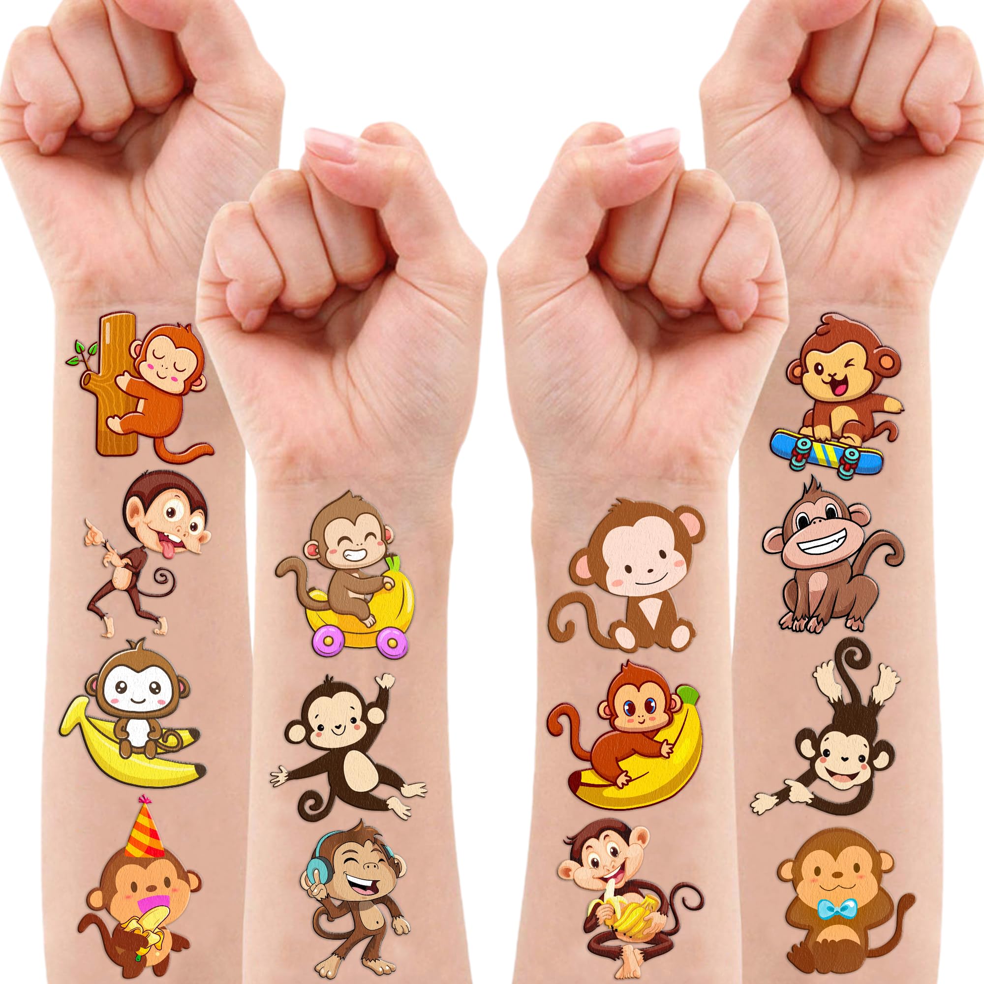 🐵 96 Fun Jungle Tattoos – Includes 96 adorable monkey temporary tattoos across 6 large sheets (6.3 x 4.7 inches each), featuring playful monkeys swinging, dancing, and smiling in colorful jungle scenes.