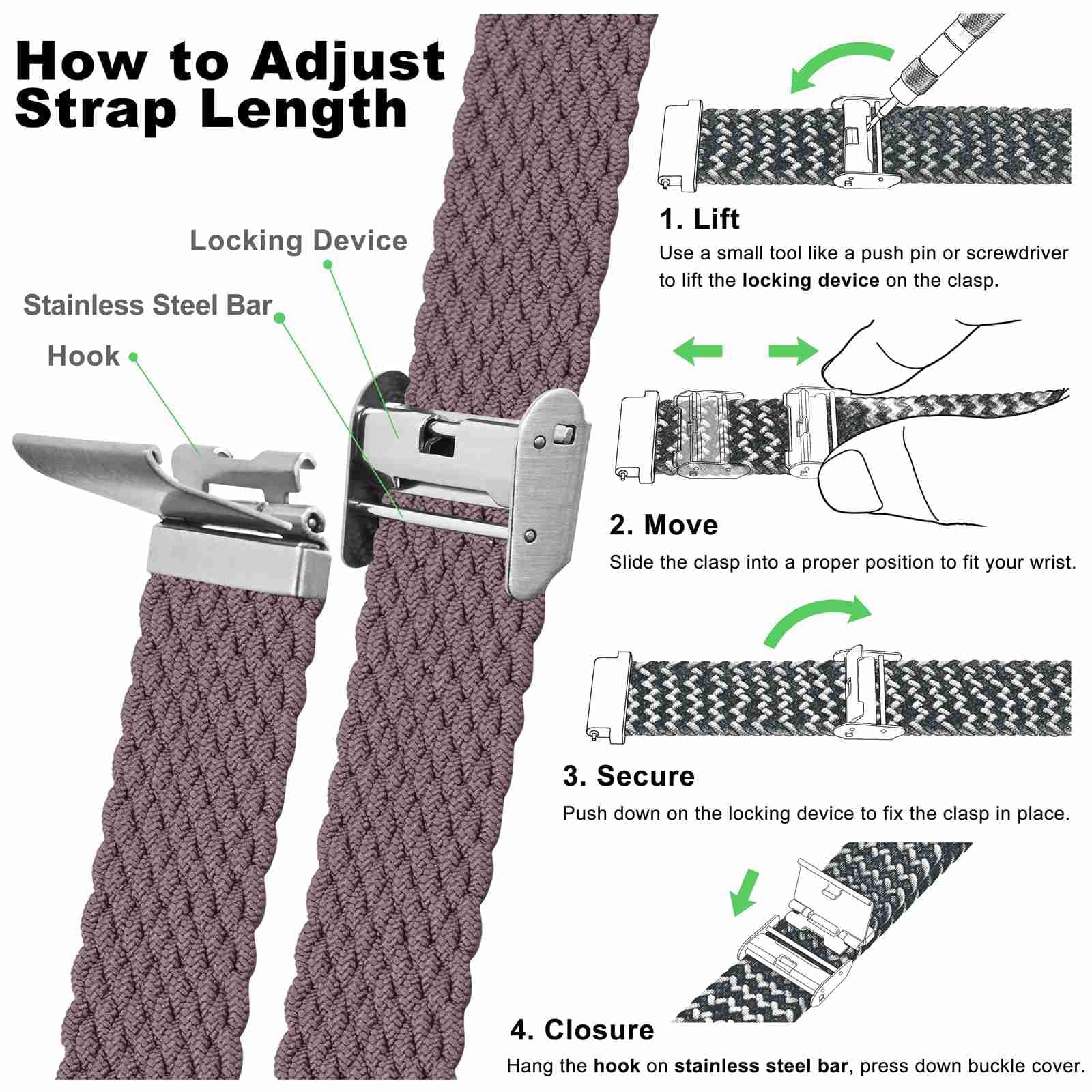 Braided Watch Band: This watch strap is made of quality stretchable yarn interwoven with silicone threads with adjustable buckle, soft, lightweight, breathable, washable, durable and comfortable to wear. Perfect for sports and everyday use.