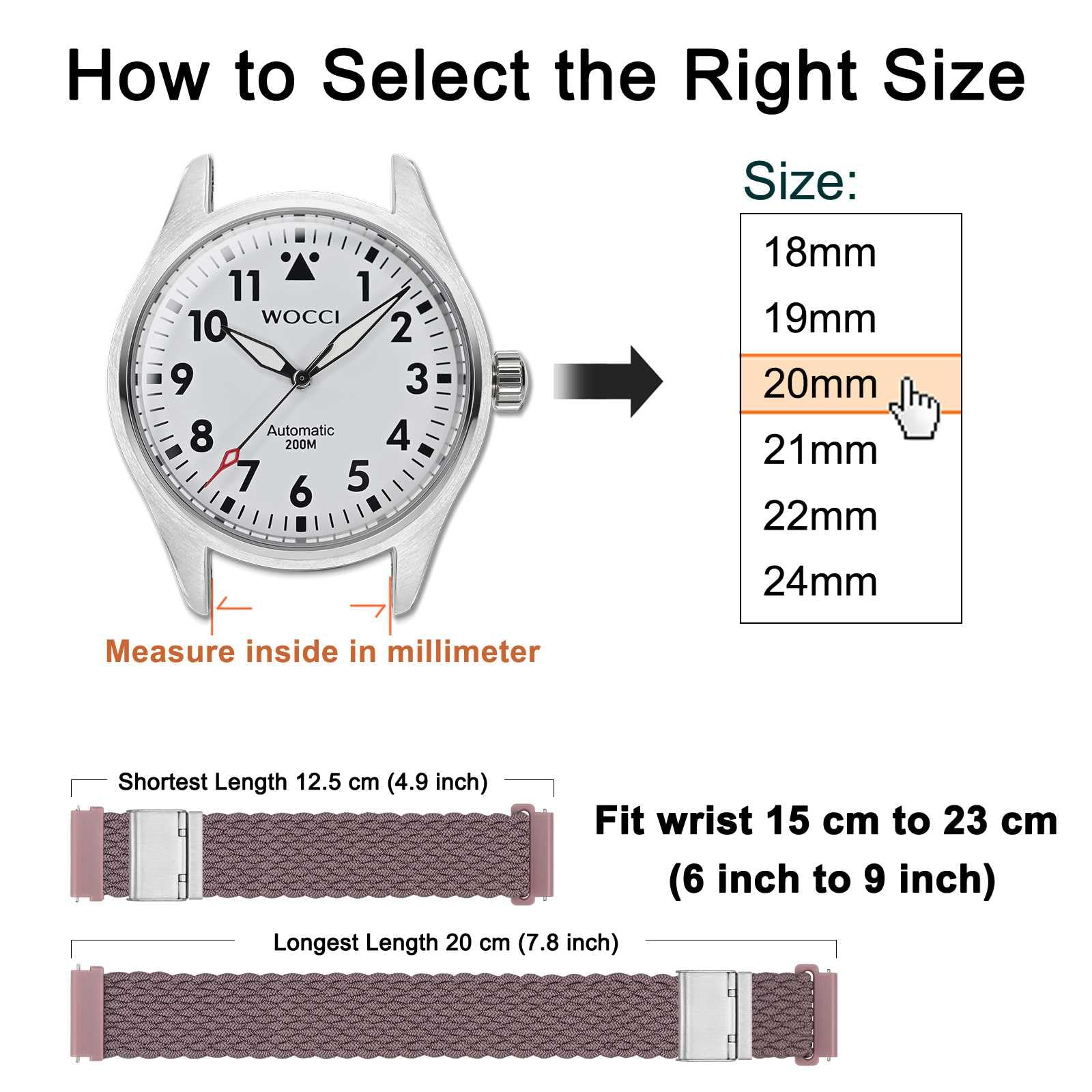 Select Band Width (Size): 16mm 18mm 19mm 20mm 21mm 22mm 24mm. Compatible with most traditional watches and smart watches which lug width is standard 16 18 19 20 21 22 24 millimeters. In order to get a suitable strap, please measure inner distance in millimeter between two horns on your watch.