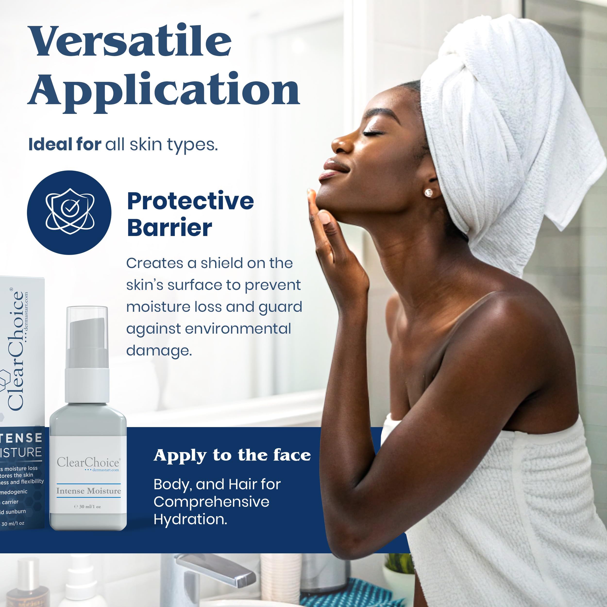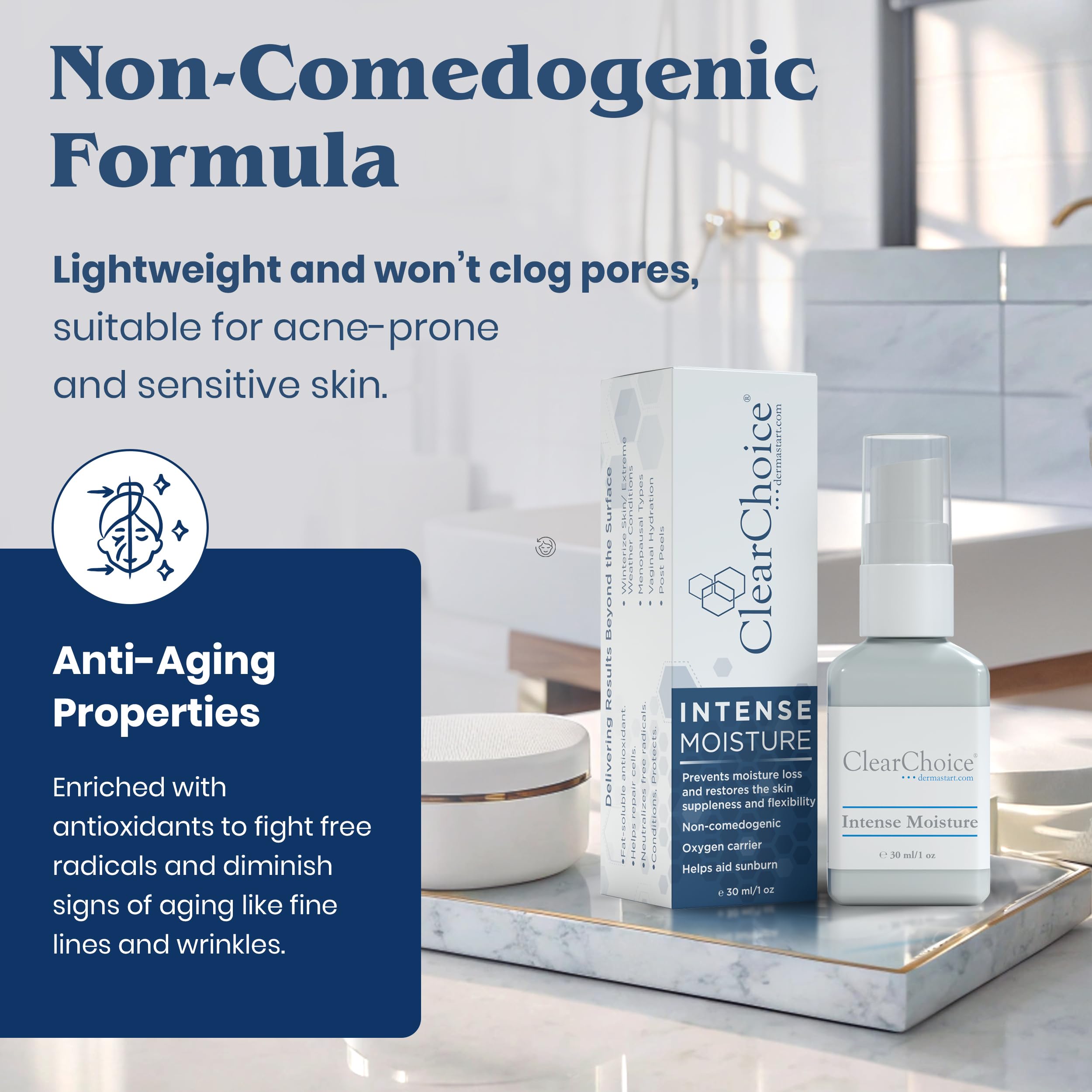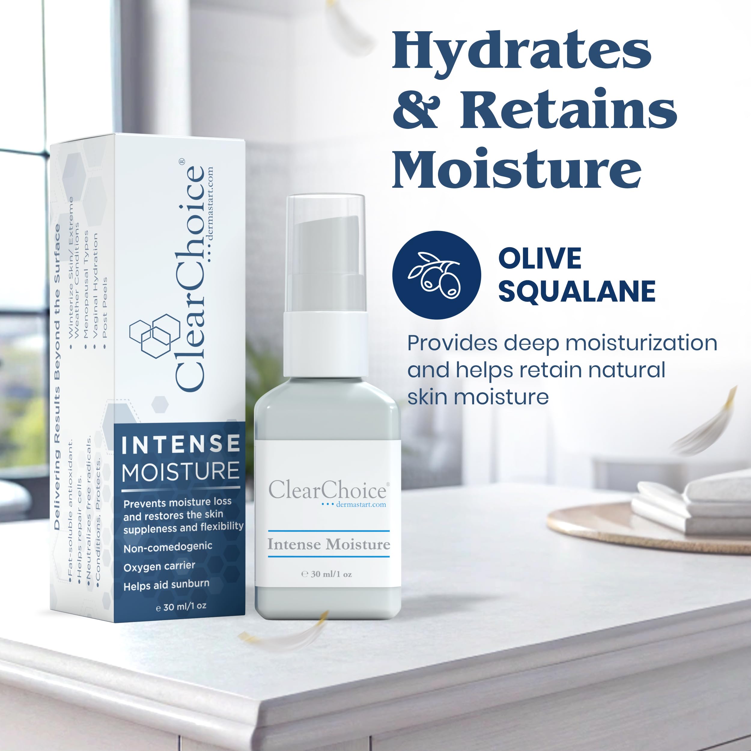 Product Description: Intense Moisture Facial Serum is your go-to solution for deep hydration and radiant skin. Formulated with 100% Pure Olive Pit Squalane, this powerful, natural oil works wonders to protect moisture-deprived skin while enhancing your skinβs ability to absorb other products. Whether you face extreme weather conditions or just want to boost your daily skincare routine, Intense Moisture delivers the hydration your skin craves. Squalane, a naturally occurring lipid in your skin, plays a critical role in maintaining your skinβs moisture and barrier function. Our olive-derived squalane is lightweight, non-greasy, and penetrates deeply into the skin, leaving it feeling soft, supple, and hydrated. Suitable for all skin types, including sensitive and acne-prone skin, Intense Moisture is designed to keep your skin balanced, hydrated, and healthy without clogging pores or causing irritation. Perfect for daily use, this serum helps to restore skinβs natural suppleness, prevent moisture loss, and reinforce your skin's defense against environmental stressors like pollution and harsh weather. With consistent use, it smooths fine lines and wrinkles, promotes a youthful glow, and keeps your complexion calm, even, and comfortable. Key Benefits: Deep Hydration for All Skin Types: Whether you have dry, oily, or sensitive skin, this facial serum delivers intense hydration by forming a protective layer that prevents moisture loss and keeps skin feeling soft and supple. It's especially beneficial for those who experience harsh weather conditions, as it helps skin adapt to both extreme dryness and humidity. Non-Comedogenic and Lightweight: Unlike other oils that can clog pores, Intense Moisture absorbs quickly without leaving a greasy residue. This makes it ideal for daily use, even on acne-prone skin. It locks in moisture without triggering breakouts or causing skin congestion. Anti-Aging and Skin Rejuvenation: Rich in antioxidants, squalane helps fight free radicals and reduces the visible signs of aging, including fine lines, wrinkles, and age spots. Regular use can result in a more youthful and radiant complexion. Supports Skin Barrier: A healthy skin barrier is essential for resilient, glowing skin. This serum strengthens the skinβs natural barrier, protecting it from environmental pollutants, irritants, and UV damage. It keeps skin calm, reducing the risk of irritation, redness, and inflammation. Calms and Soothes Irritated Skin: Whether youβre dealing with redness, inflammation, or irritation from conditions like eczema or rosacea, squalaneβs soothing properties help reduce discomfort and calm sensitive skin. Versatile for Face, Body, and Hair: This multifunctional serum can be used not only on the face but also on other parts of the body that need moisture and protection. It's great for dry patches, cracked heels, or even as a hydrating hair oil for smooth and shiny locks. Enhances Other Skincare Products: Intense Moisture doesnβt just hydrate on its ownβit also enhances the absorption and effectiveness of other products in your skincare routine, acting as a superior vehicle for delivering additional nutrients to your skin. How to Use: After cleansing, apply a few drops of Intense Moisture to your face and neck, massaging gently in upward motions. You can use it alone or layer it over a moisturizer for an added hydration boost. Use day and night for best results. It can also be applied to other dry areas of the body or even the ends of your hair to prevent dryness and split ends. Ingredients: Olive Pit Squalane βhelps to lubricate and protect the skin while preventing moisture loss.