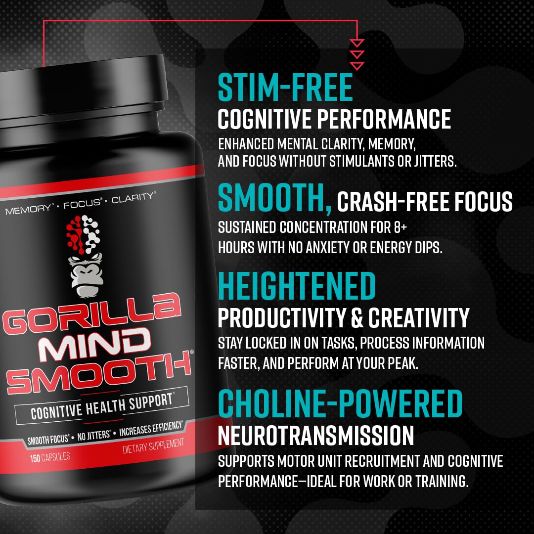 MORE FOCUS · MORE CLARITY · NO JITTERS - Gorilla Mind Smooth is free of any dirty stimulants, providing a smoother, much less extreme level of energy, but still maximizing the mental clarity that you are looking for in a Nootropic formula.